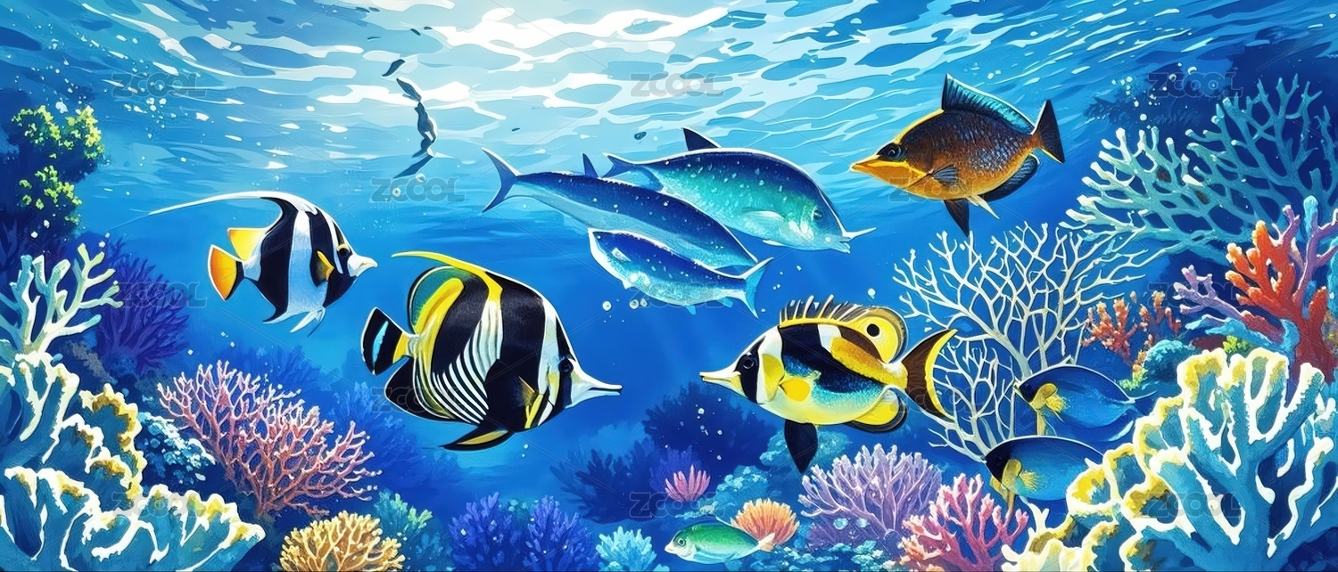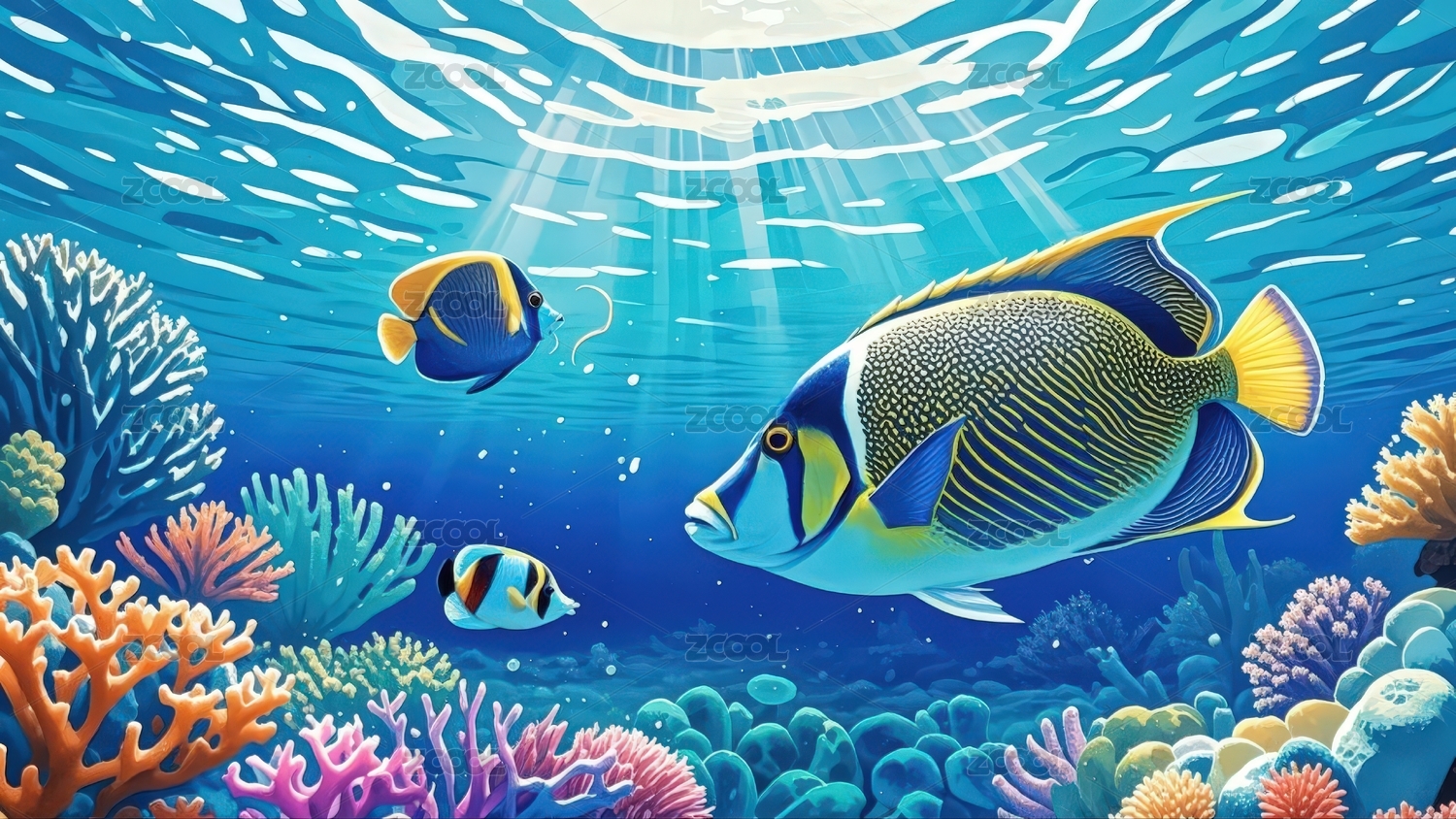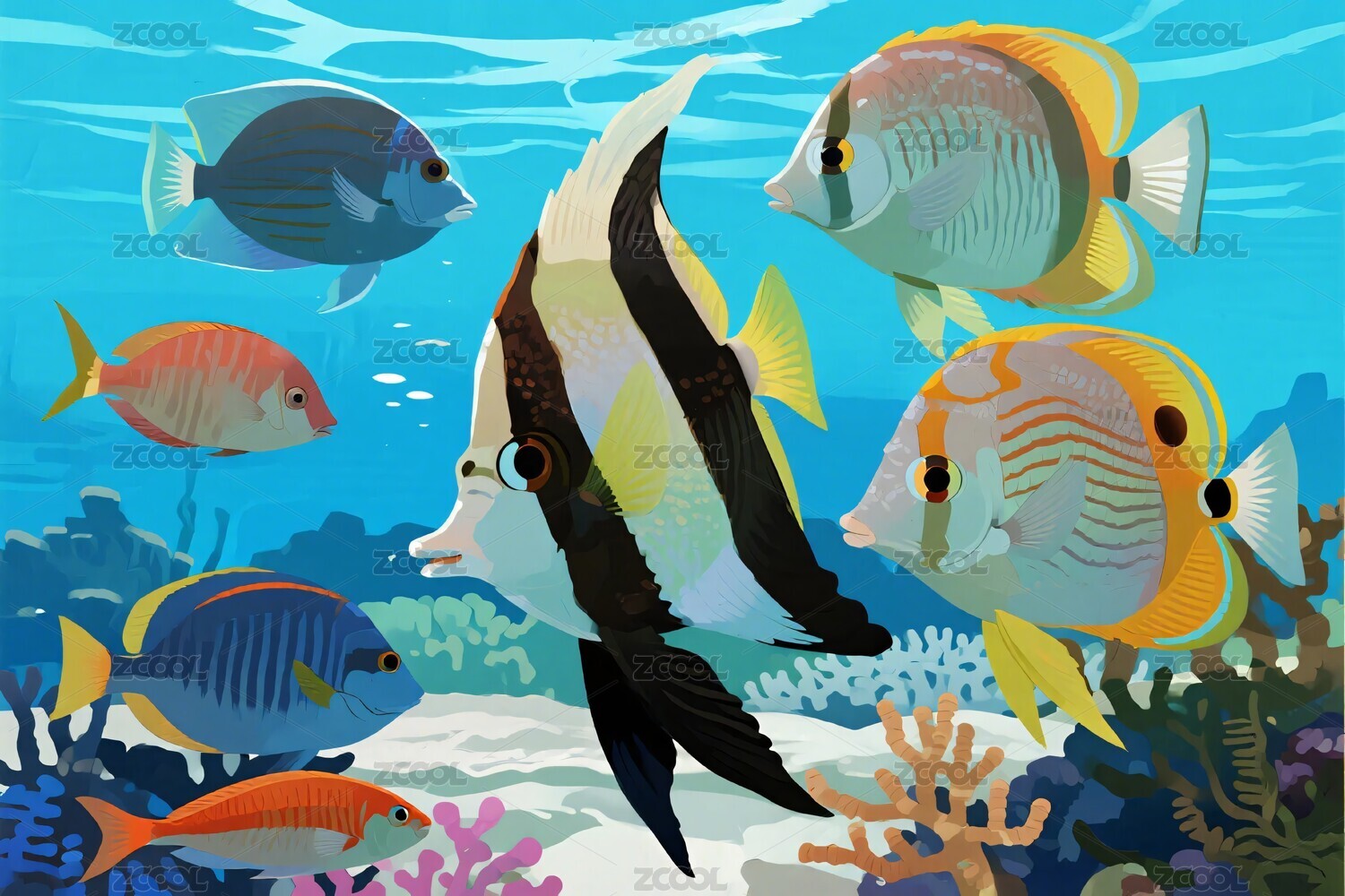 热带鱼,珊瑚,水草,海洋,插画,卡通,水生生物,彩色,插画风格,水族场景