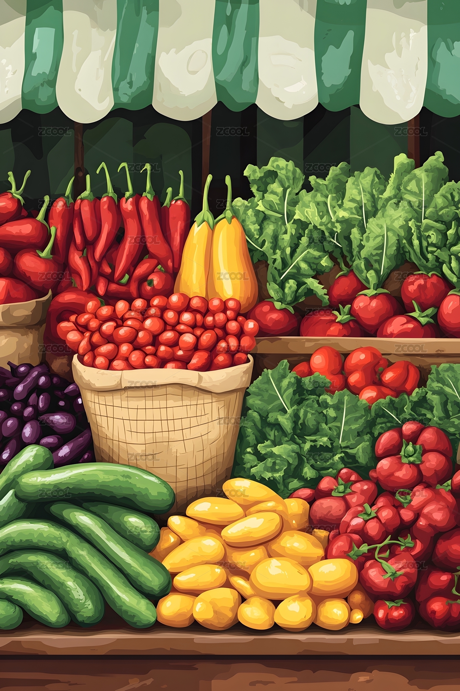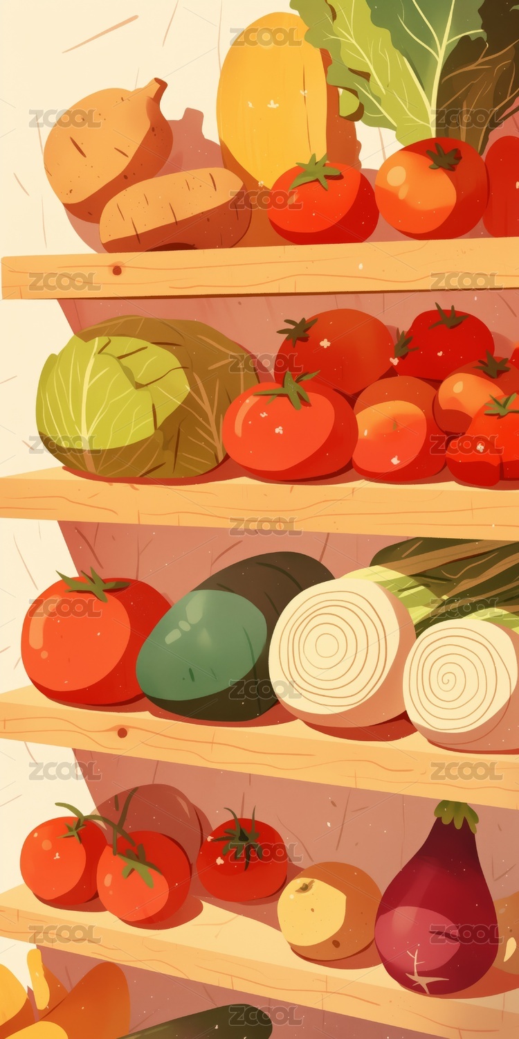 清新明亮长条平板货架上整齐的蔬菜扁平插画