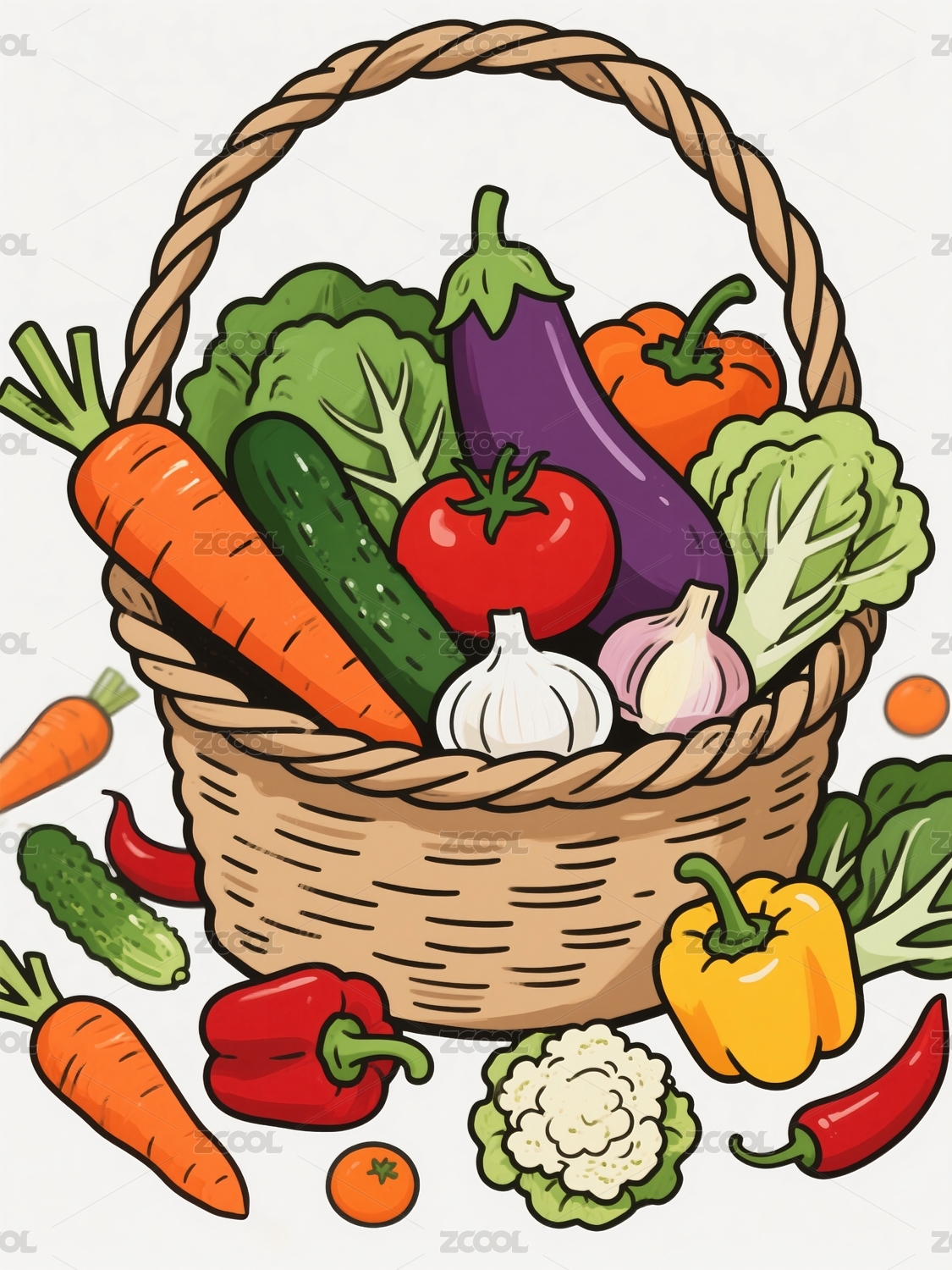 菜篮子里面装有牛奶西瓜水萝卜等食材