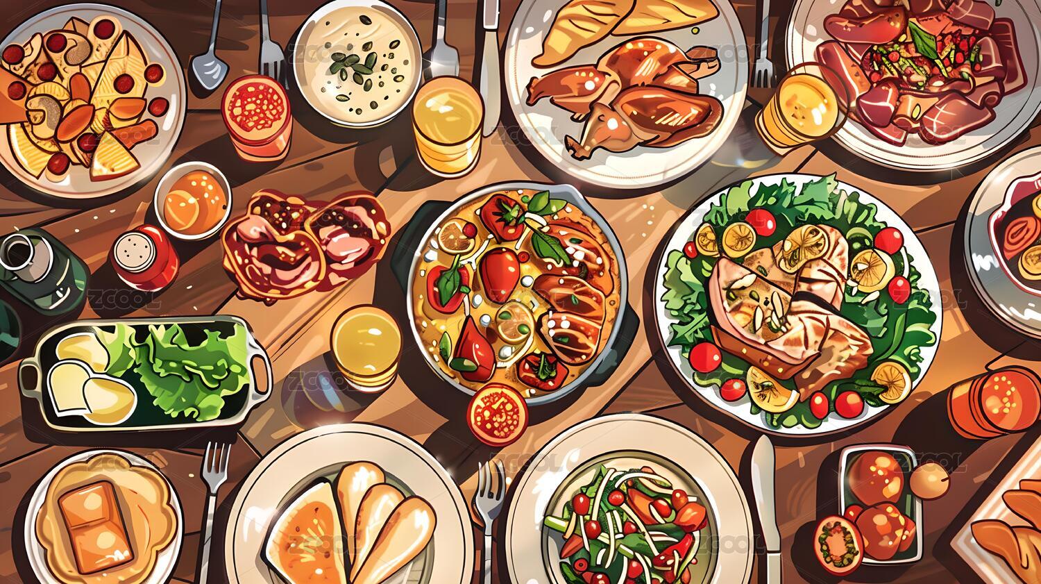 餐桌上多样美味菜肴展现