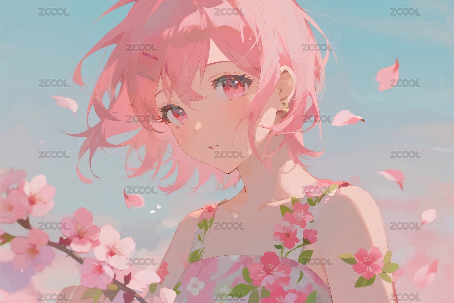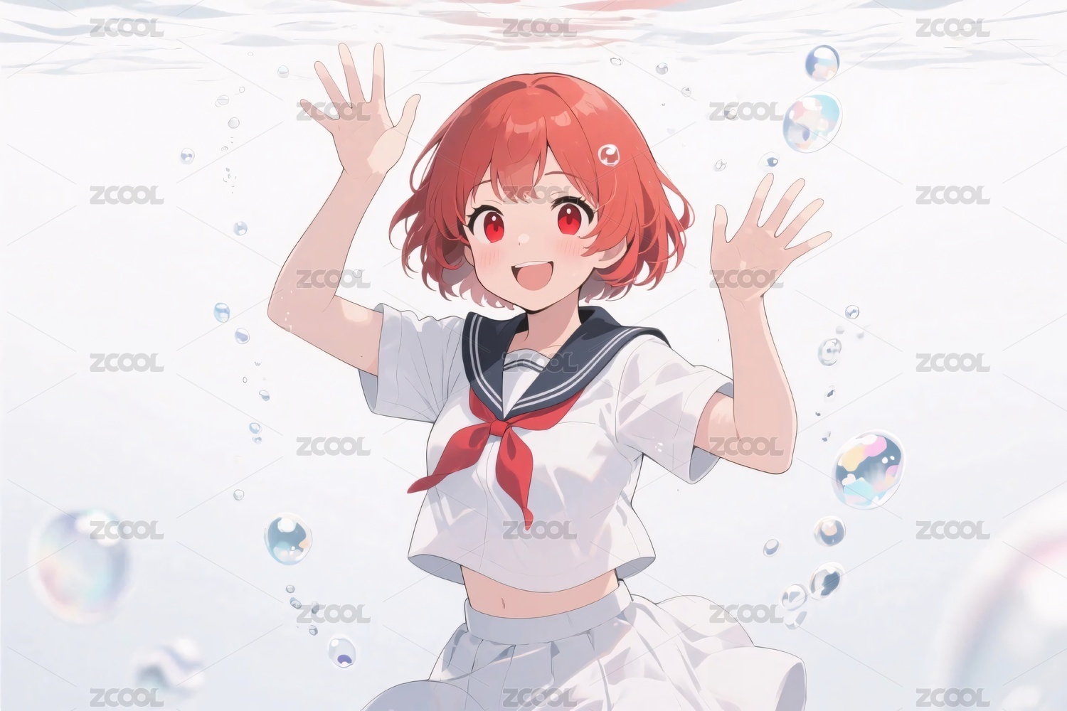 水下,女孩,插画,漫画,矢量,海洋,粉色头发,蓝色眼睛,羽毛,泡泡