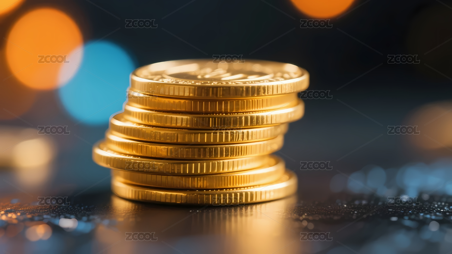 铜色硬币叠放蓝光斑