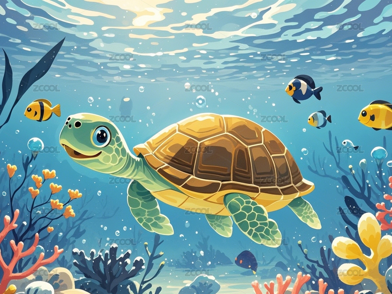 鱼类,海龟,螃蟹,海草,珊瑚,海洋,插画,矢量,卡通,水生动物