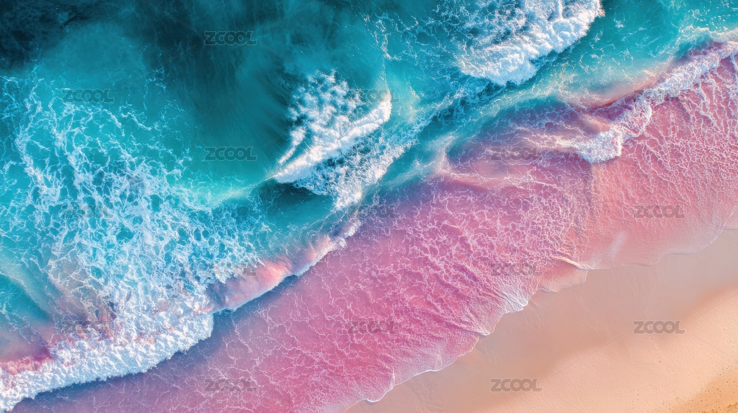 粉色沙滩蓝色海浪俯拍图