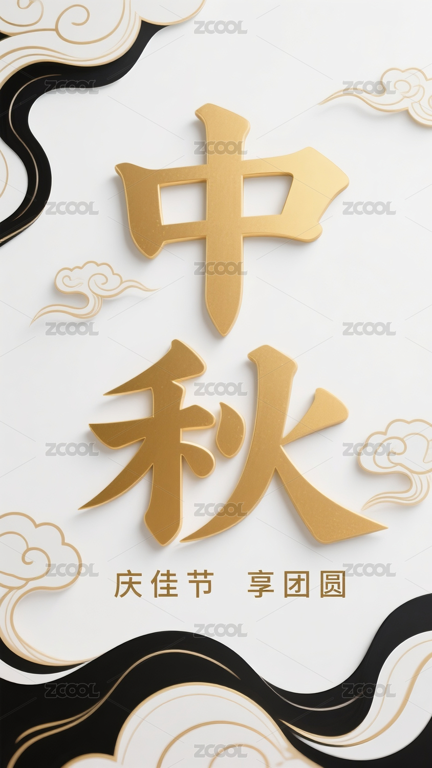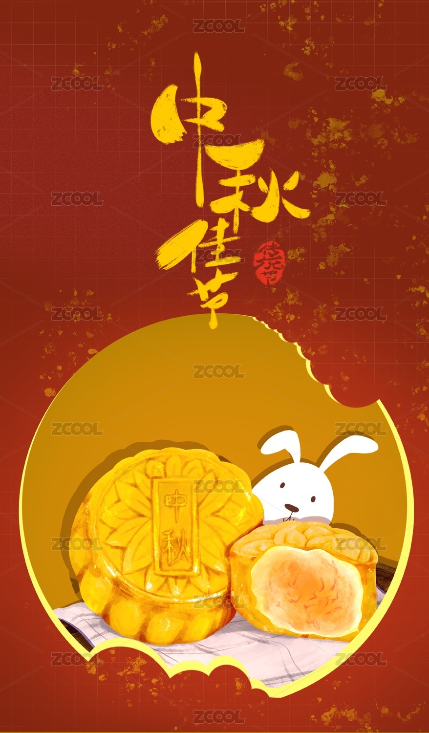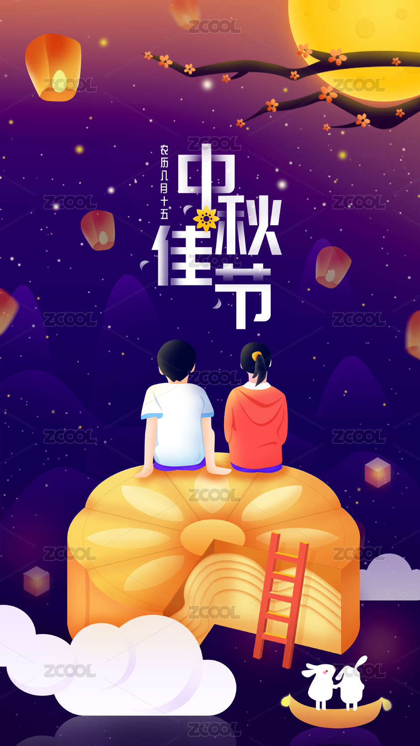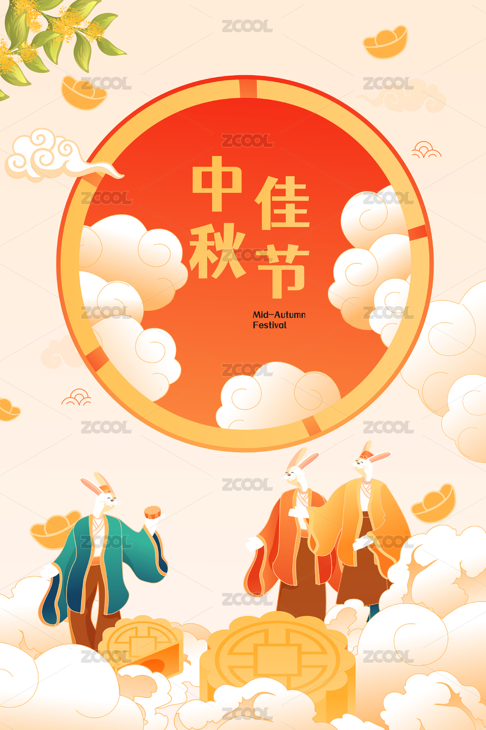 中秋节祥云月亮人物月饼兔子描边国潮矢量插画