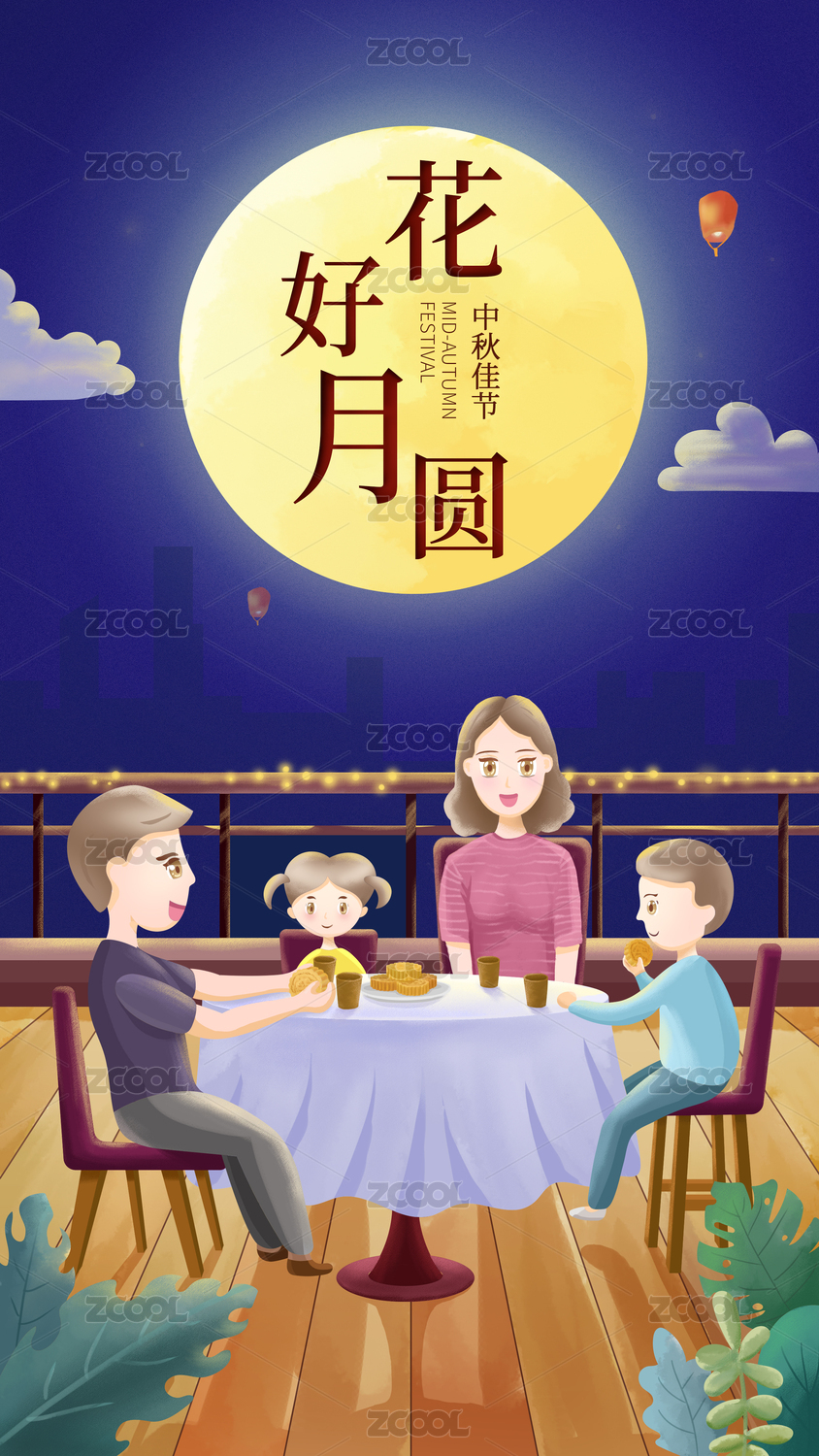 中秋佳节一家人团聚赏月花好月圆中秋节插画