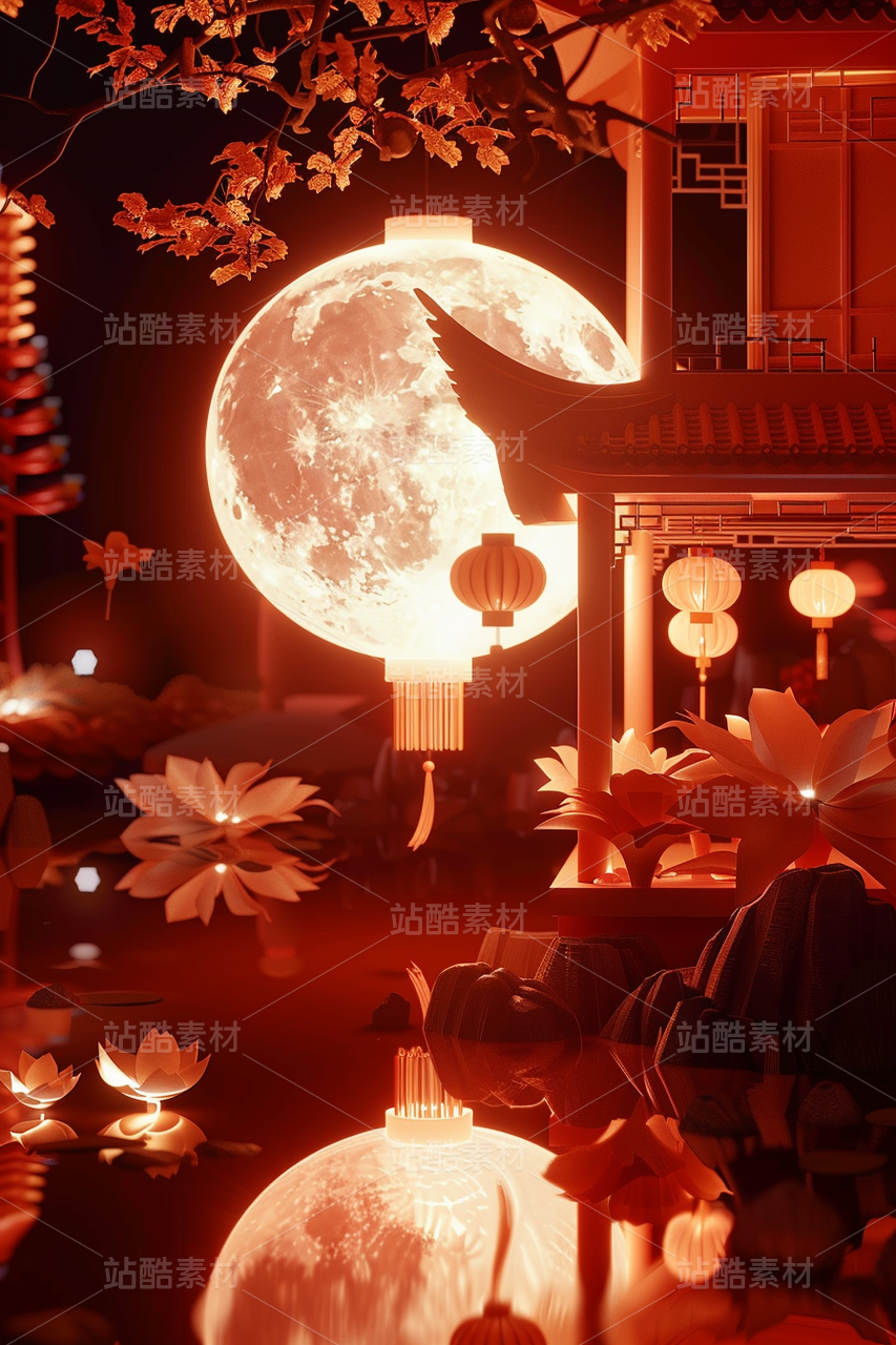 中秋节海报月饼,灯笼桂花,中式风格月亮,中秋佳节