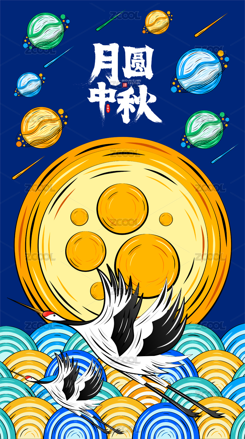 月圆中秋国潮仙鹤热闹庆贺送福矢量插画海报