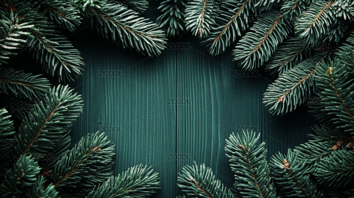 松枝水滴绿色木板背景
