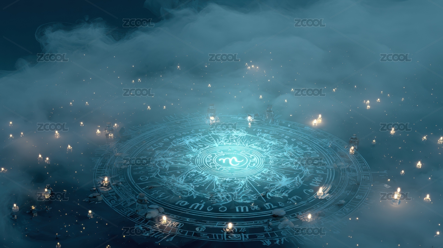 光环,符号,盘面,神秘,古老,图案,光点,云雾,蓝色,背景