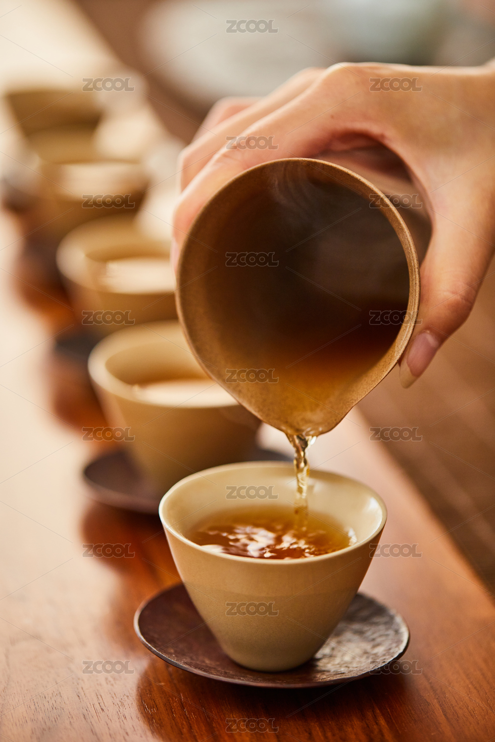 木纹茶桌上倒茶的一瞬间