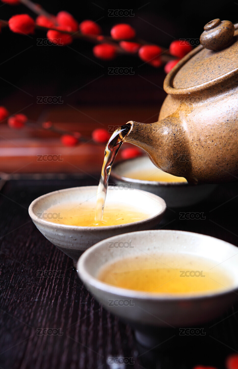 茶壶倾倒茶水到茶碗中