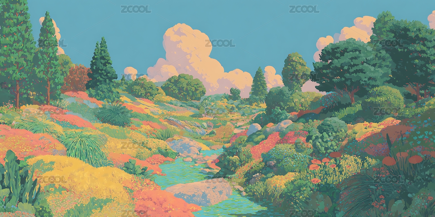 缤纷山丘风景画