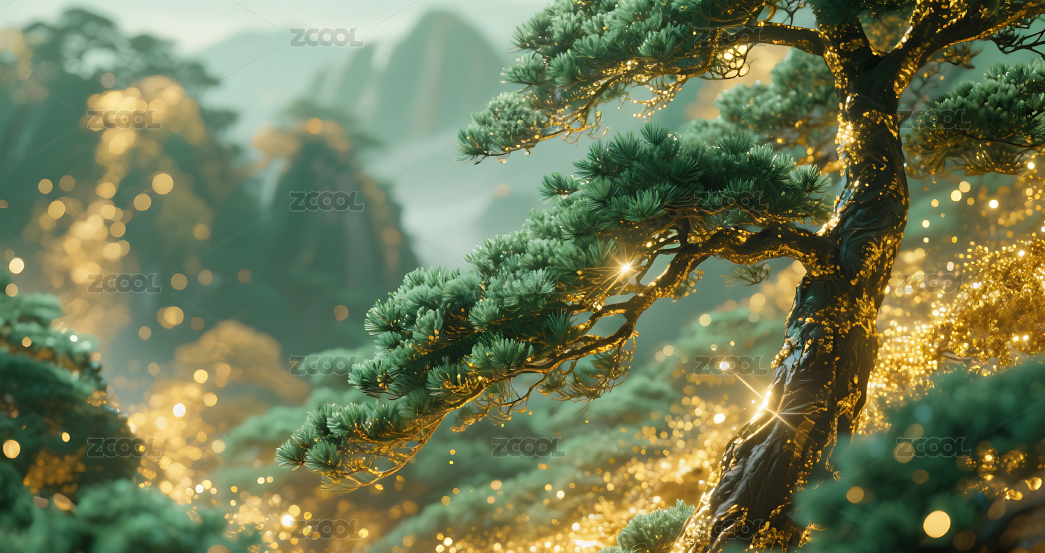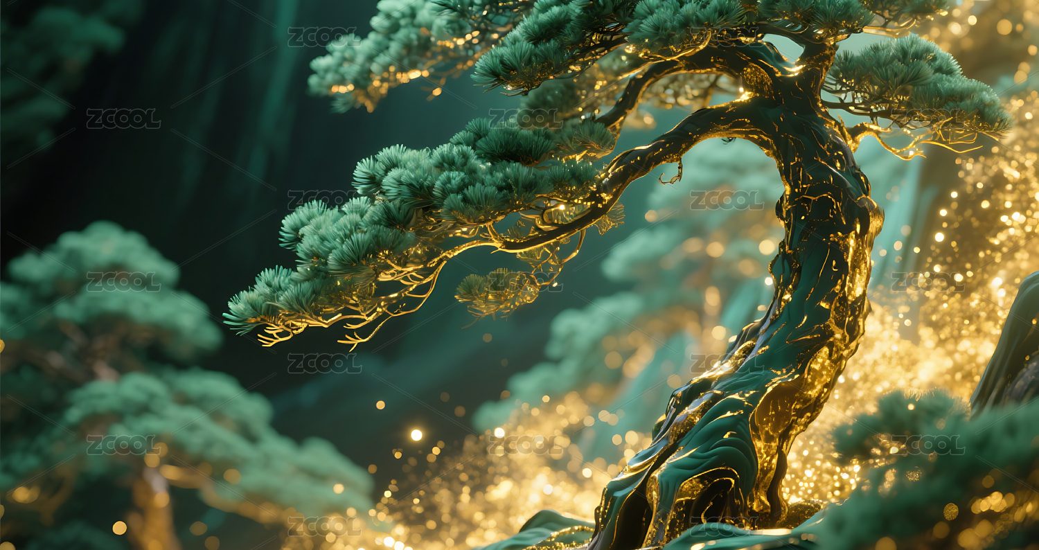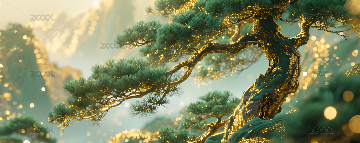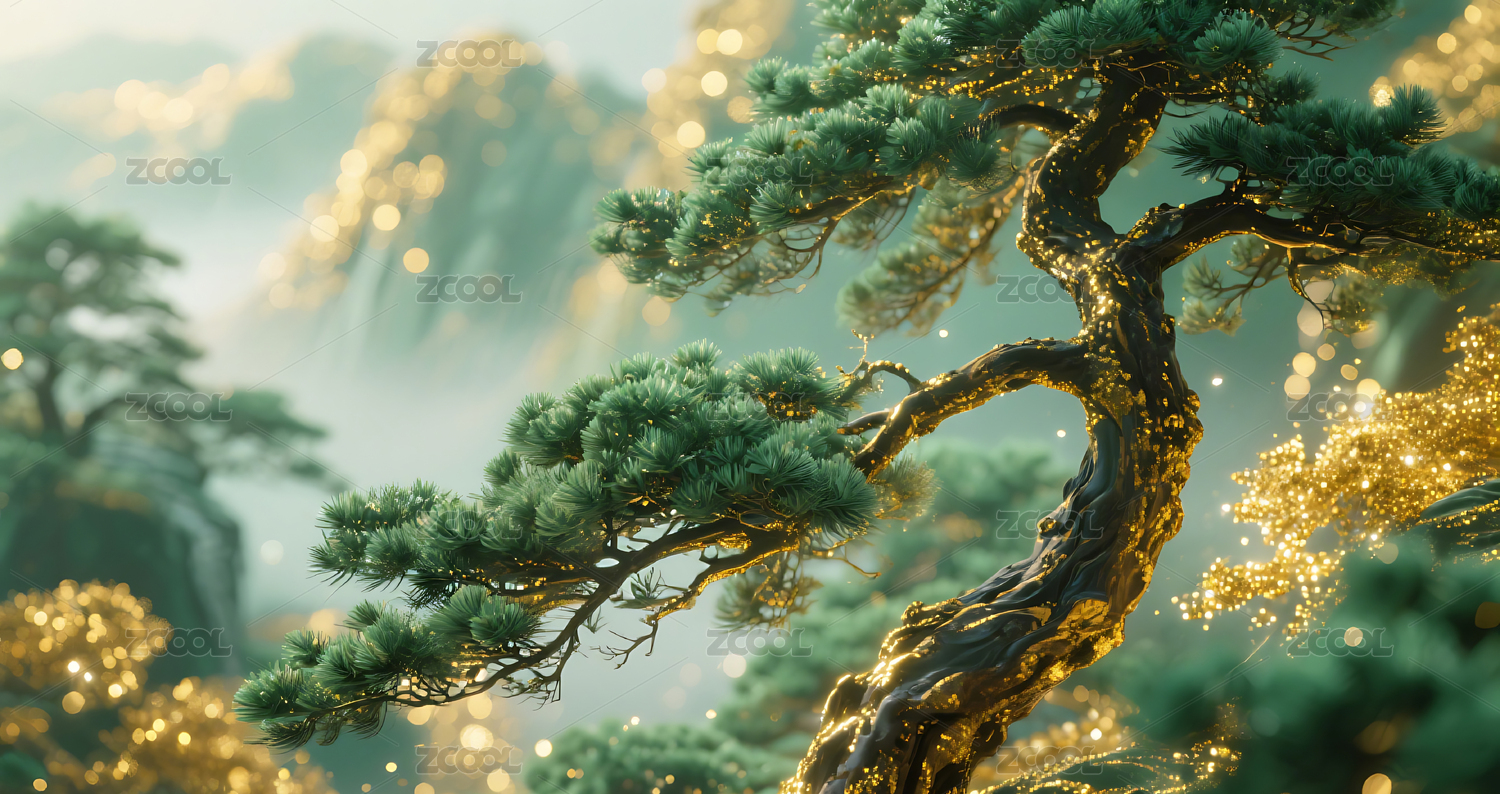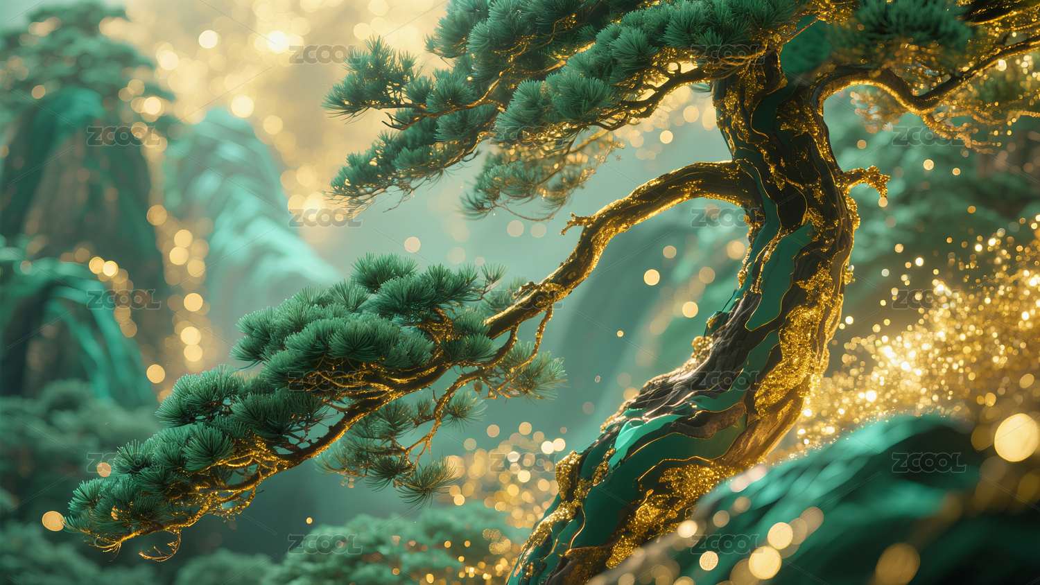 国风,梦幻,青绿色,金色,苍松,立体,抽象,背景,翠柏
