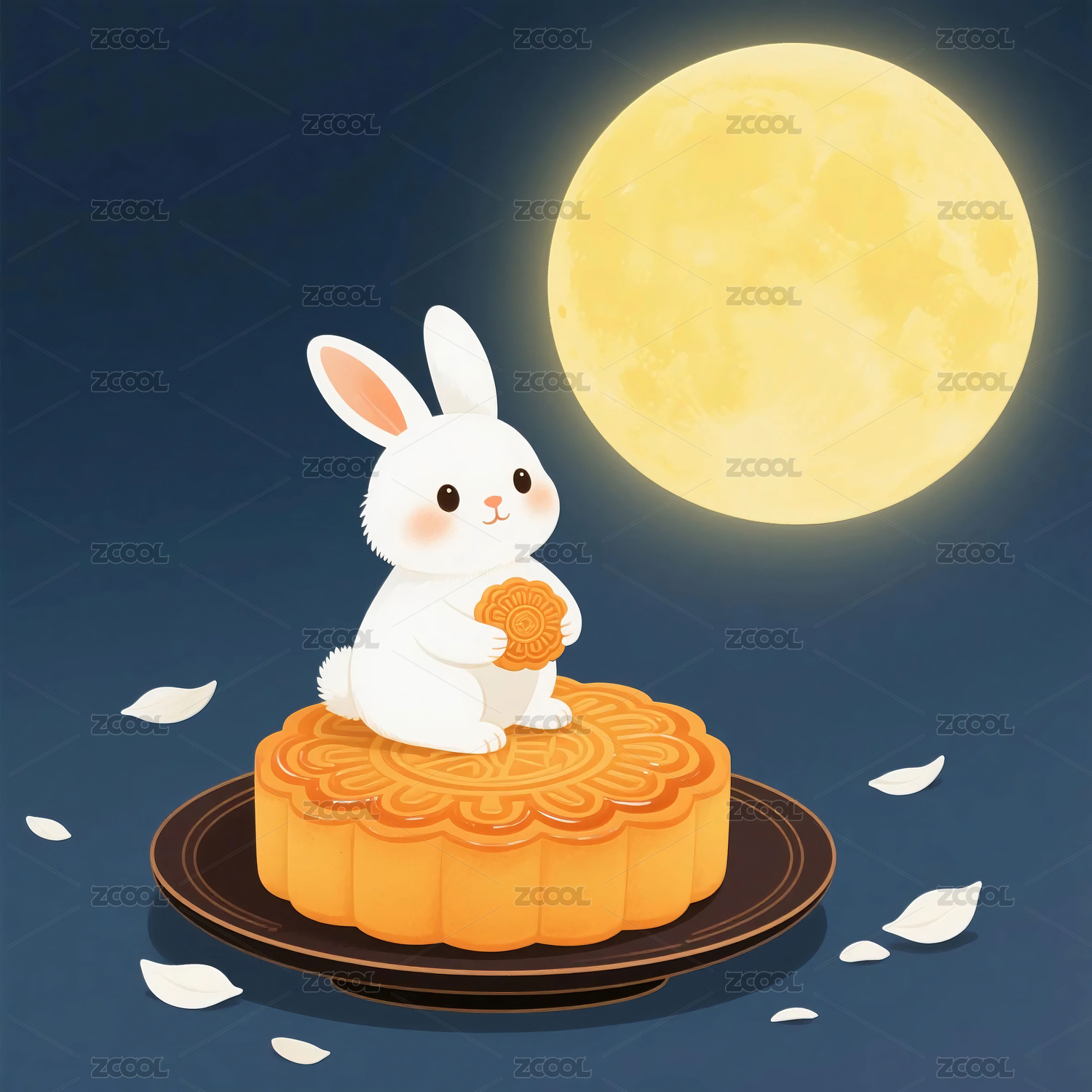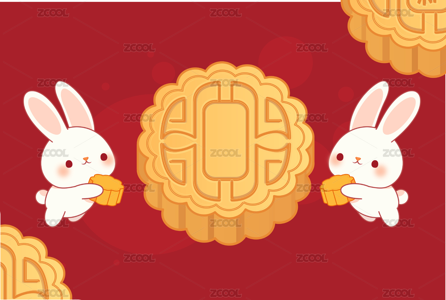 中秋节汉服玉兔小白兔月饼云朵三维图