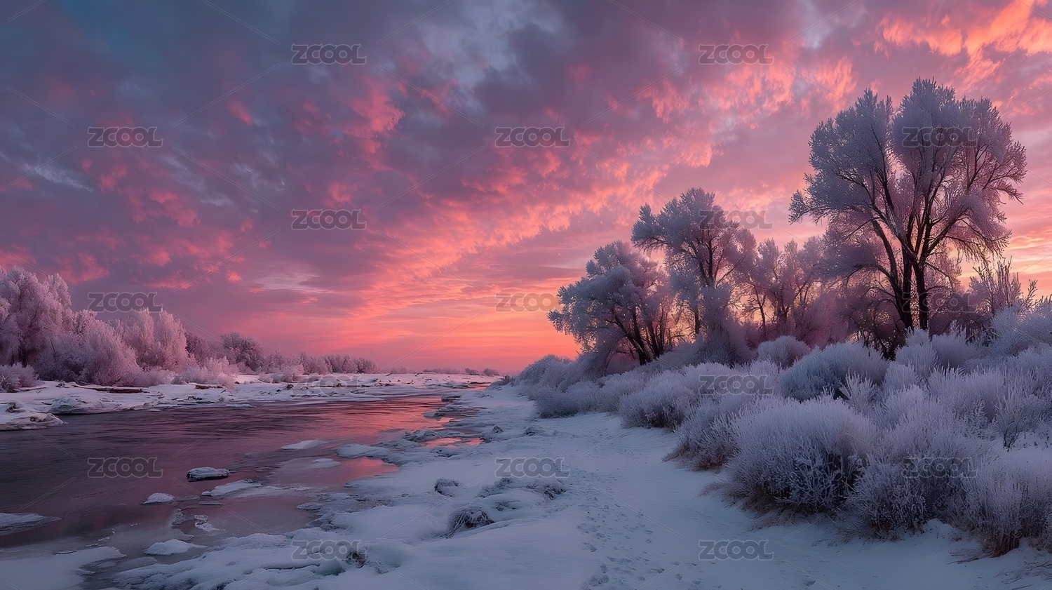 梦幻冬日雪中星空树下水边绘画般的梦境
