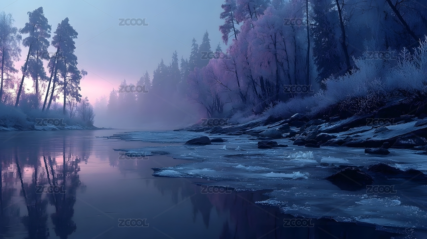 河流,树林,天空,水面,粉色,风景,自然,插画,景观,光影