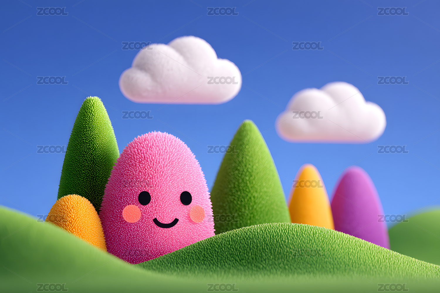 毛茸茸的可爱卡通形象与彩色的绒毛山丘