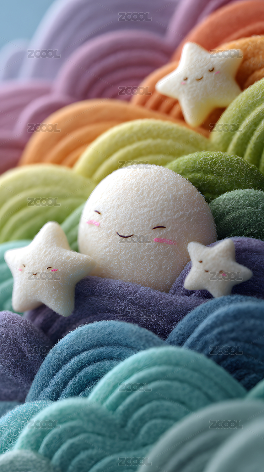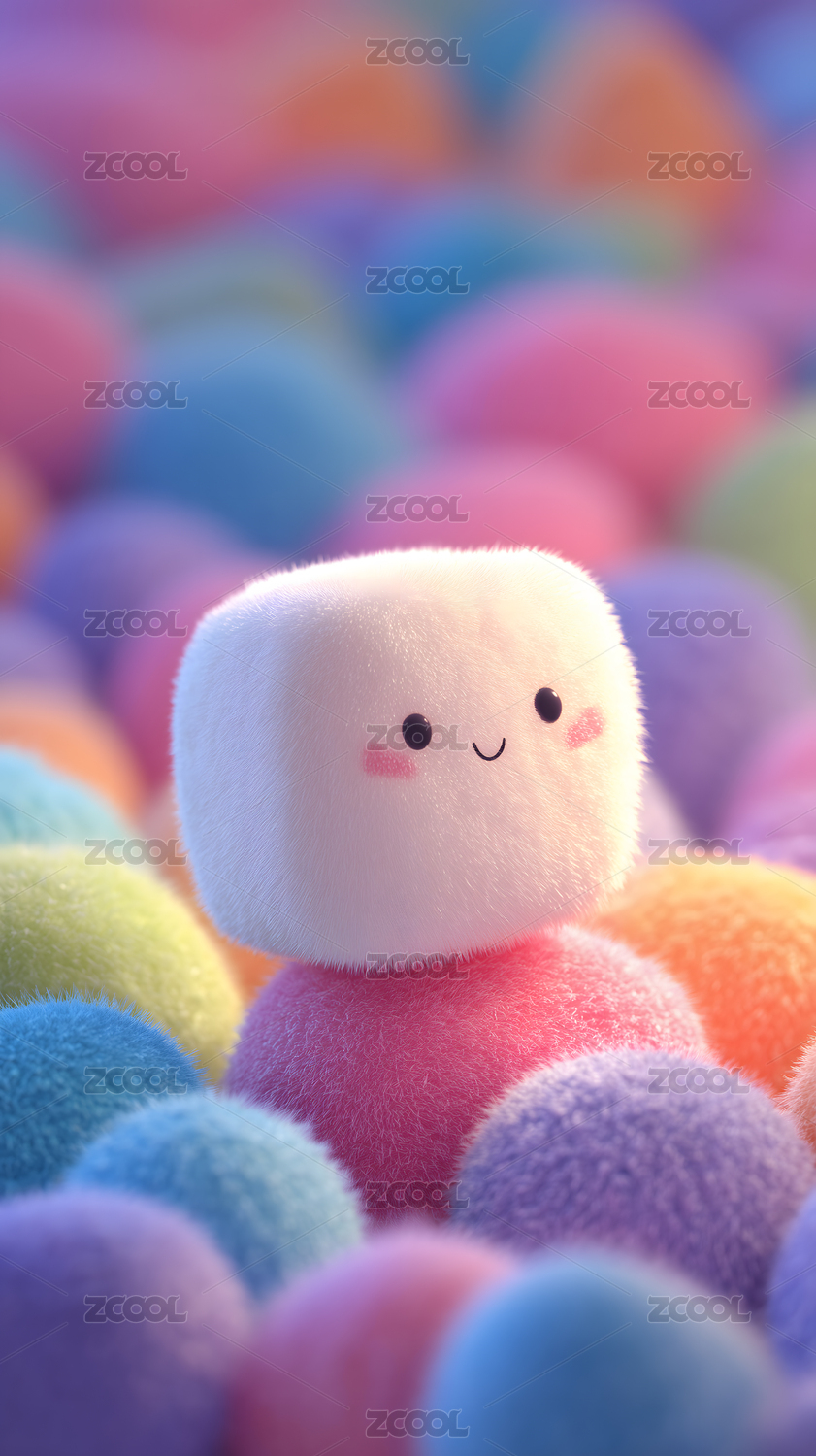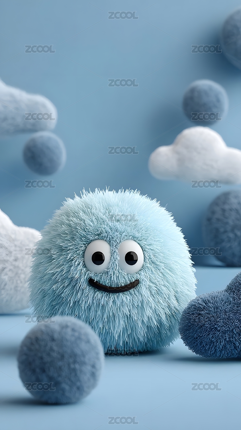 毛茸茸的可爱卡通形象与彩色的绒毛山丘