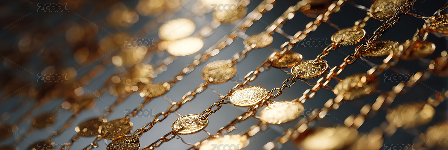 一堆金色的硬币和胶卷背景是模糊的金色光斑