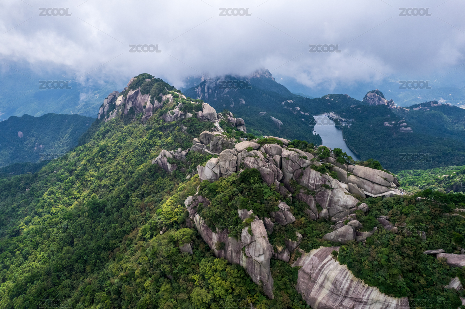 蓝天下太姥山的花岗石山峰及山腰的栈道