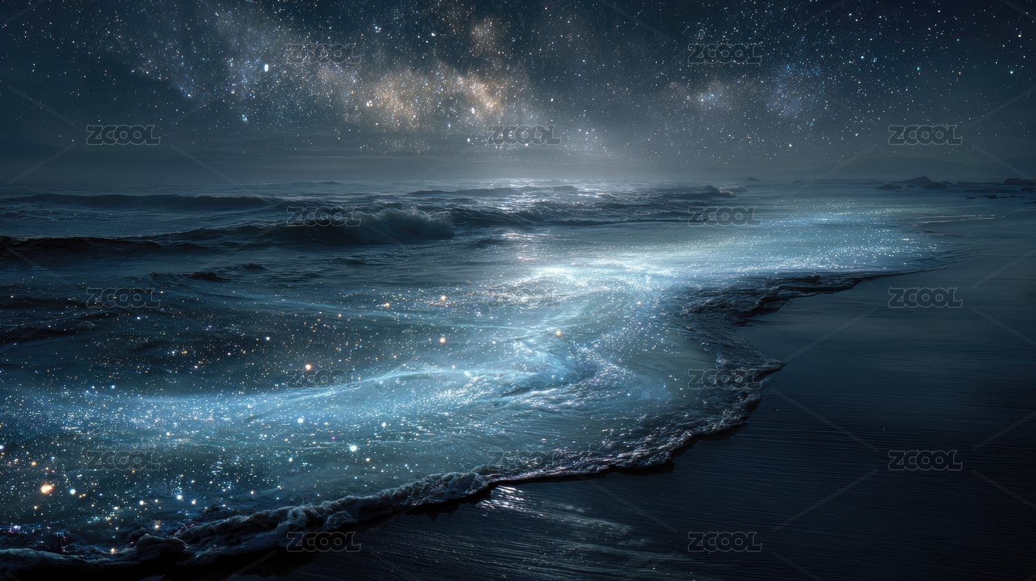 夜空中月光下唯美的蓝色荧光海梦幻风景