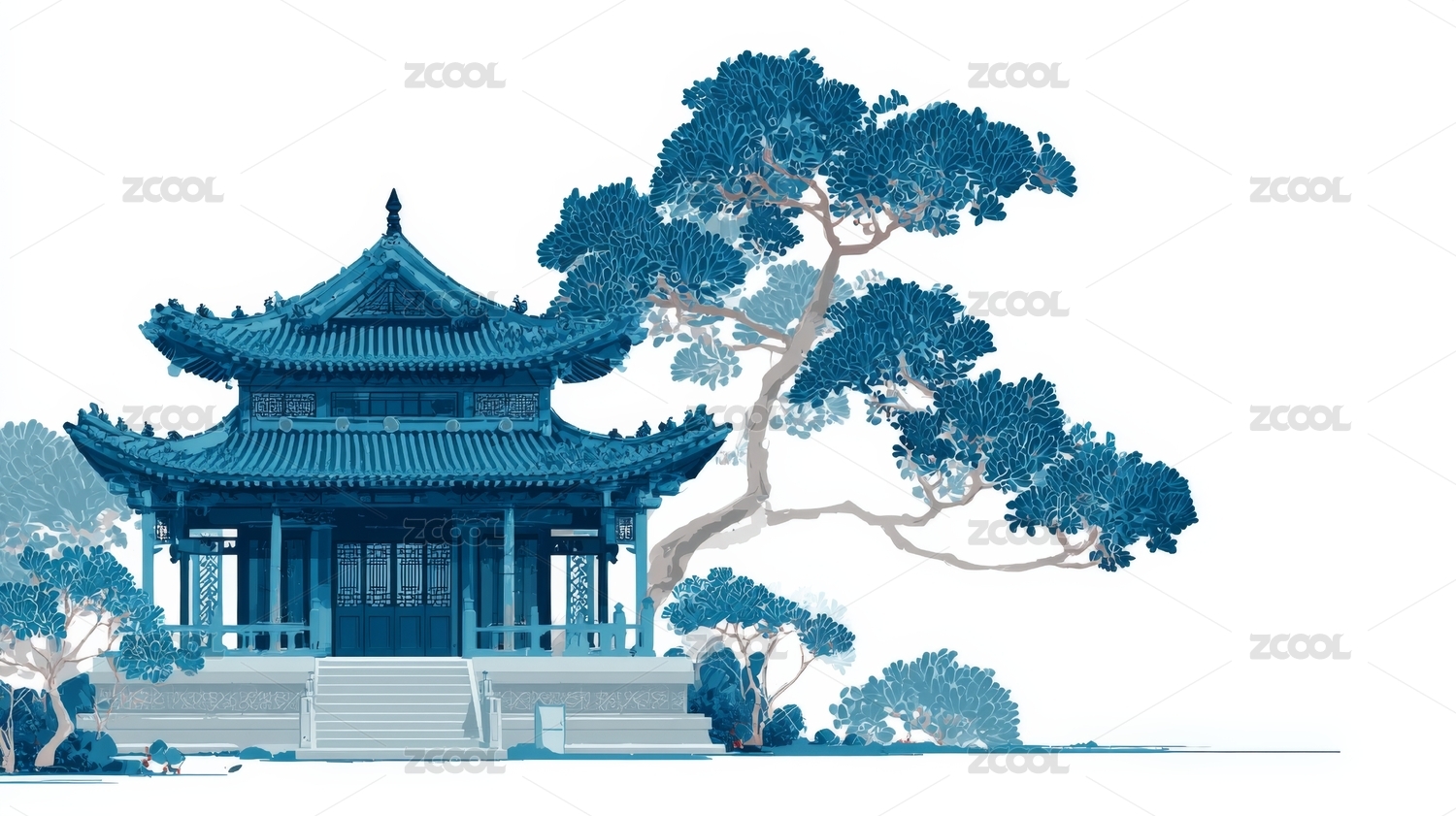古建,插画,月夜,国风,中式建筑,传统楼阁,夜景,山水,意境,手绘