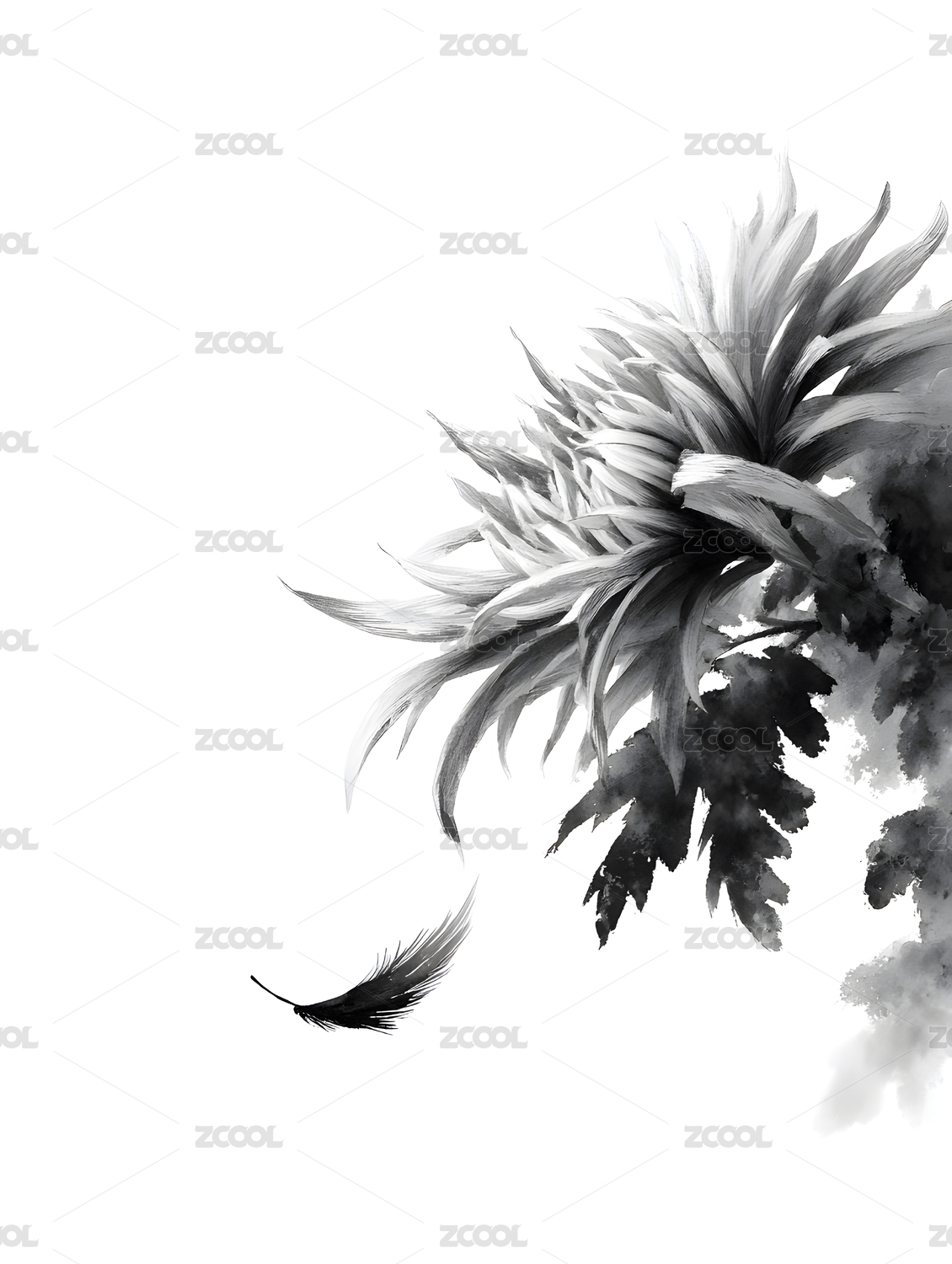 水墨菊花旁飘落的羽毛