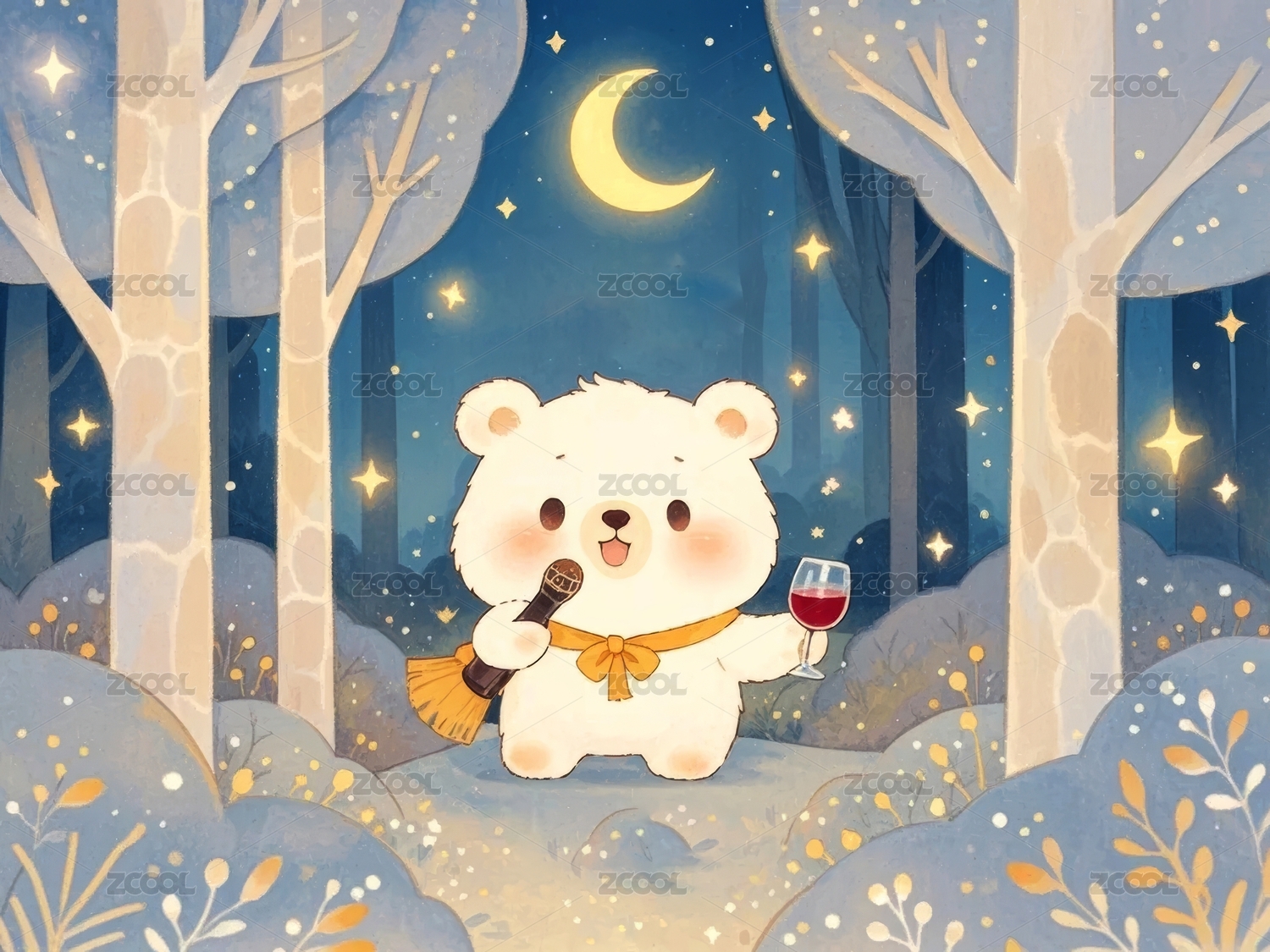 白熊月夜温馨野餐场景