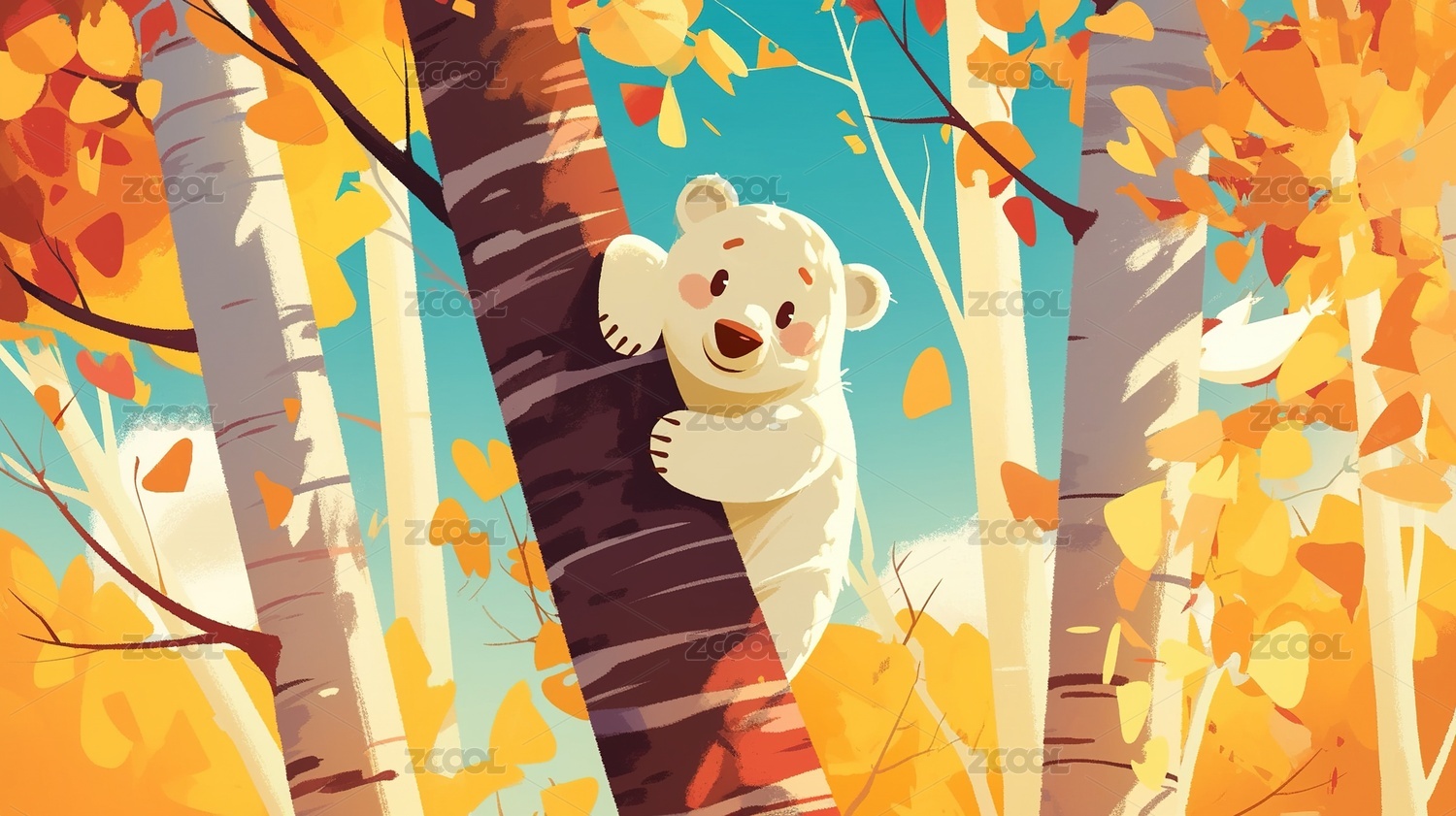 卡通小熊,森林,树木,叶子,可爱,童趣,插画,卡通动物,森林场景,插画风格