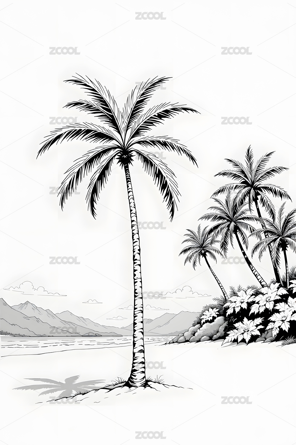 黑白,椰树,海景,插画,自然,海洋,植物,剪影,风景,模板