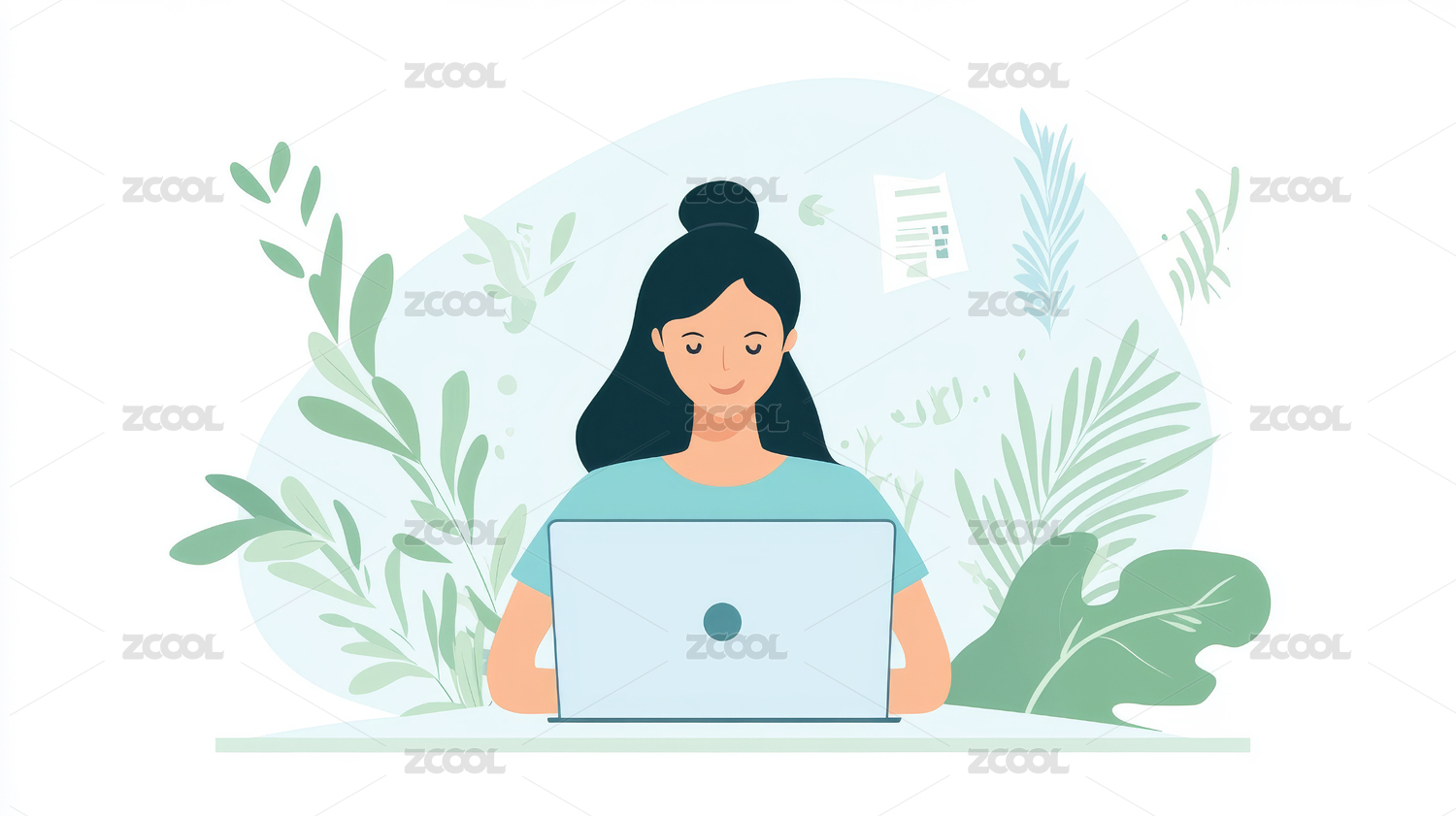 女孩在植物丛中办公工作插画