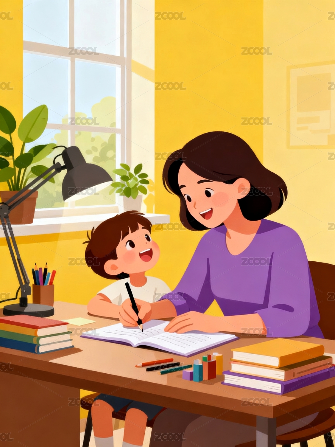 一个妈妈在给孩子辅导作业窗户书桌插画
