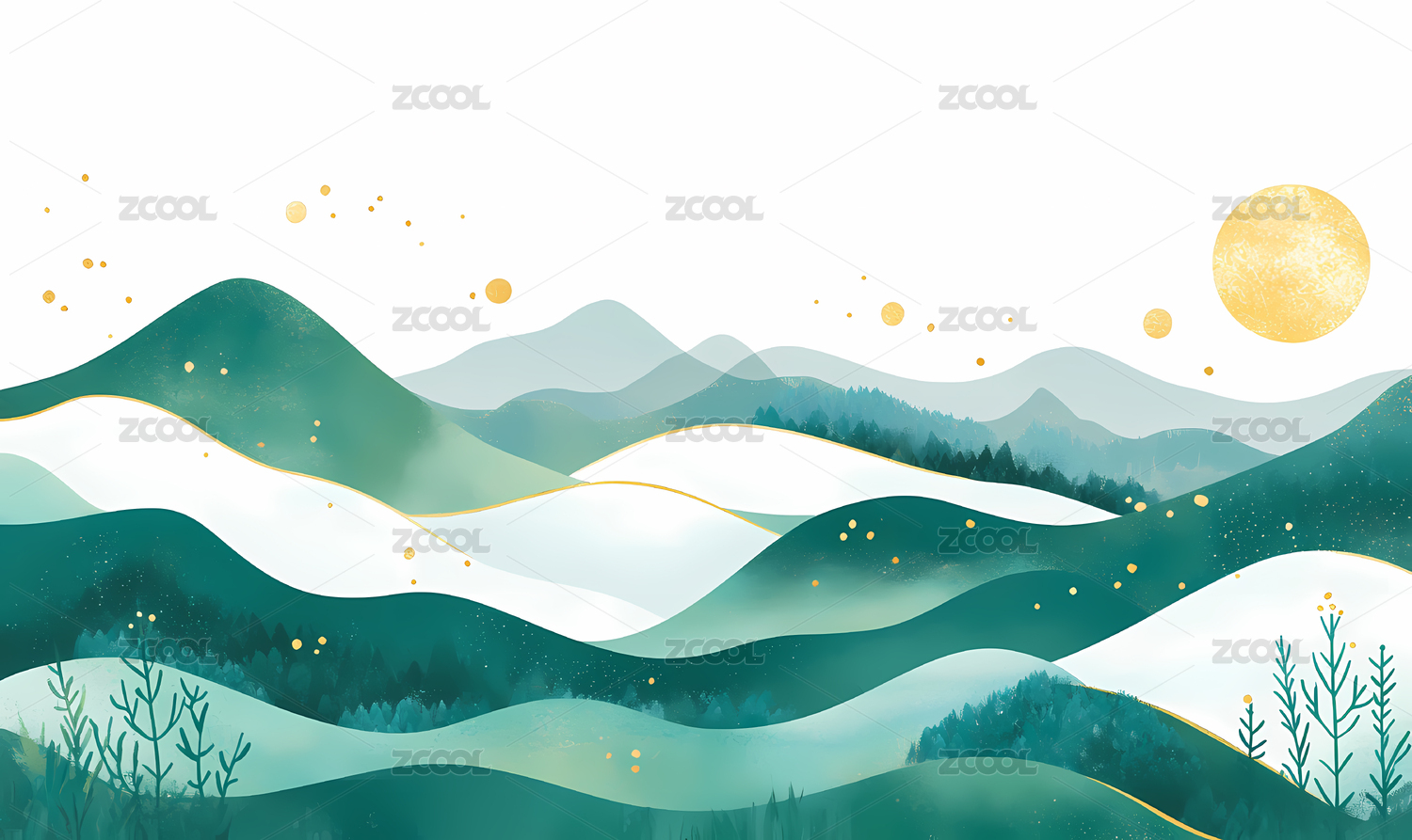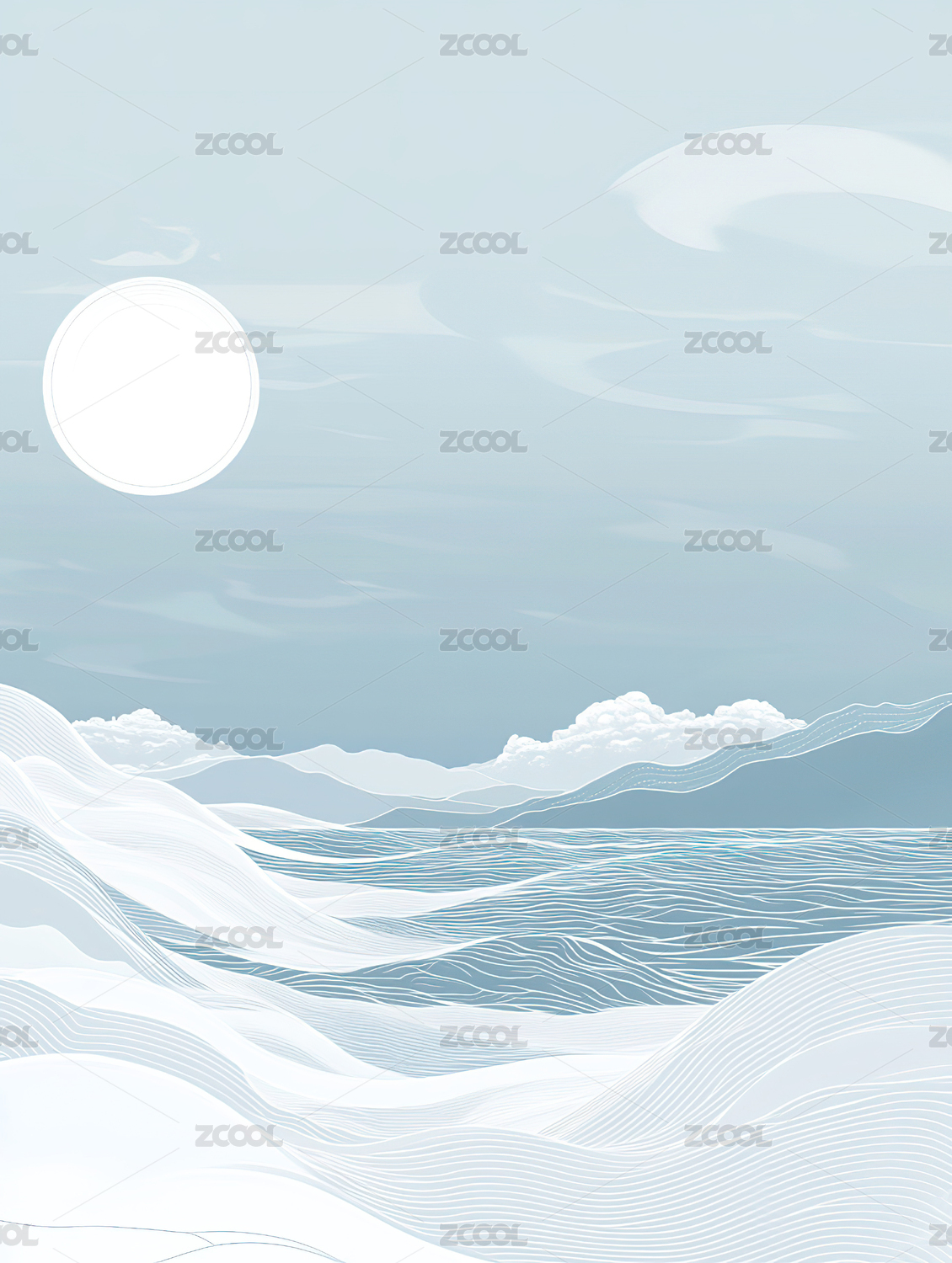 山水,插画,水墨,意境,月亮,蓝色,风景,手绘,传统,艺术