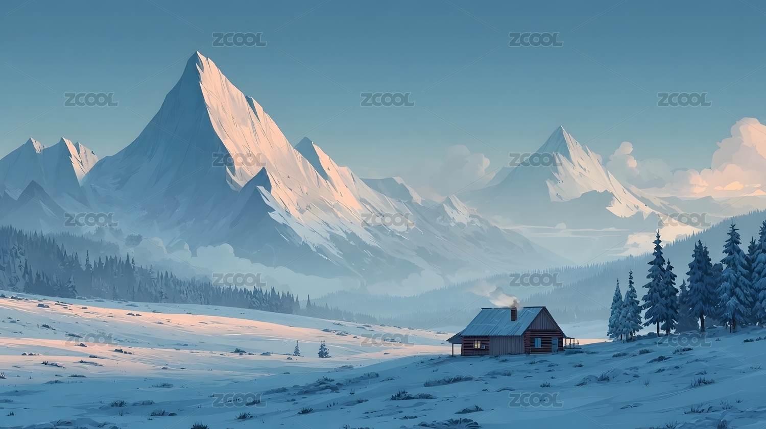 雪中木屋与远山