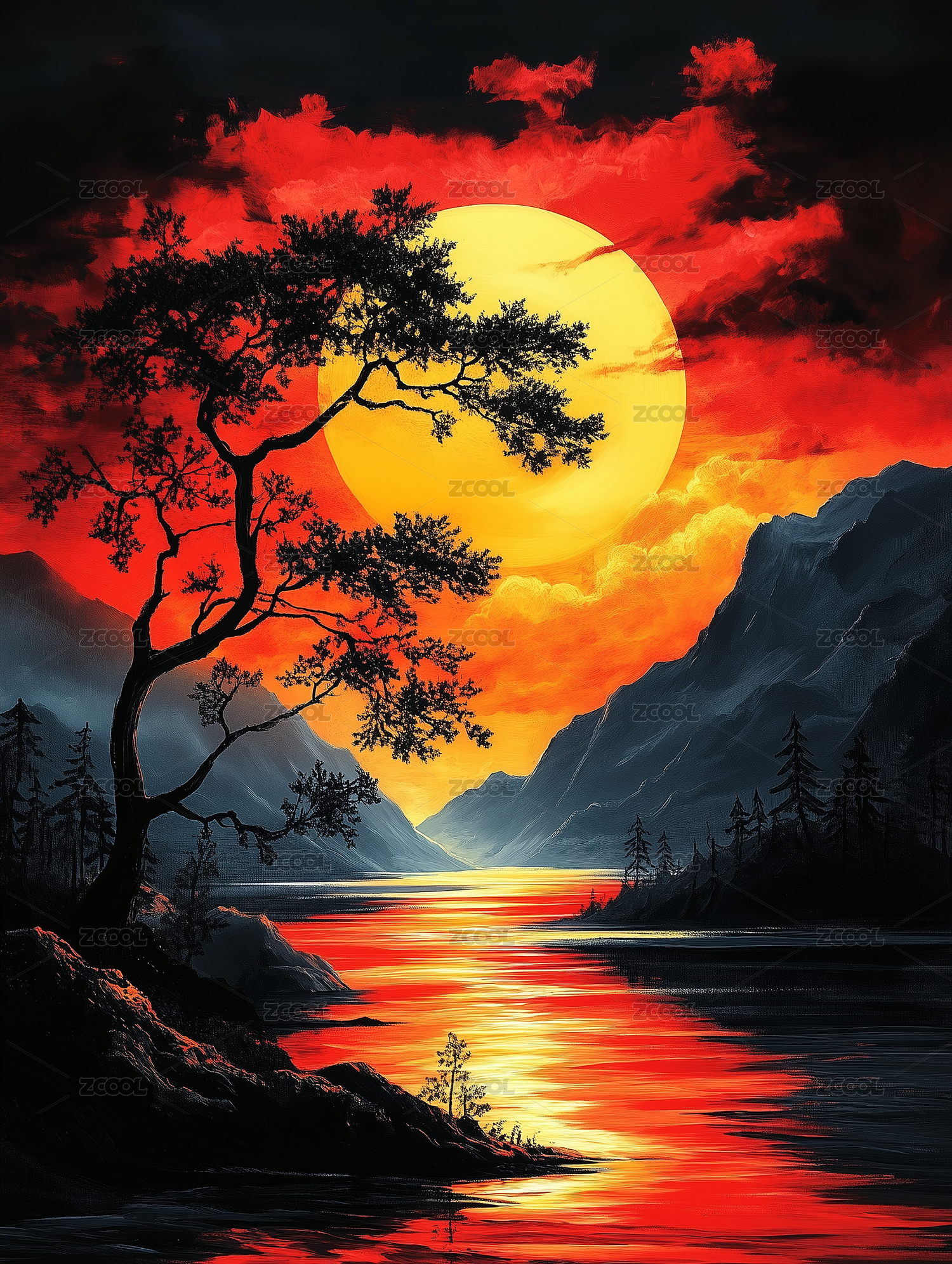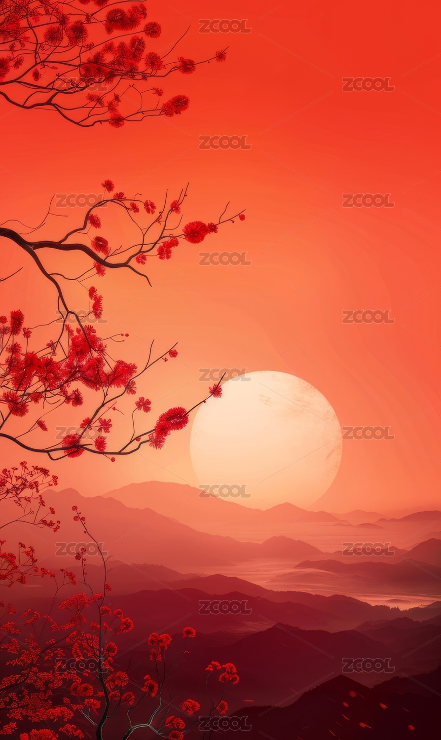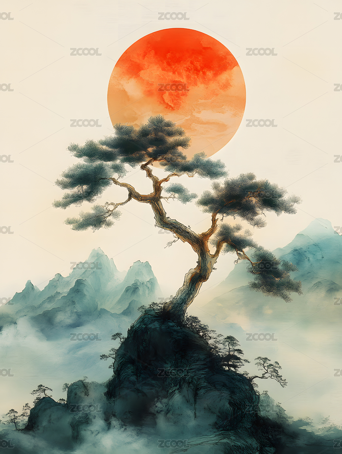 高山红日国风水墨画