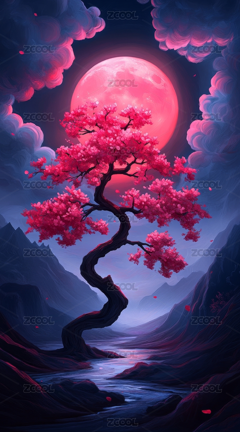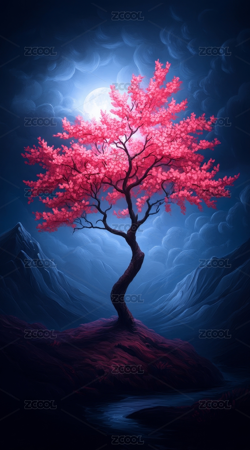 粉色月夜樱花树