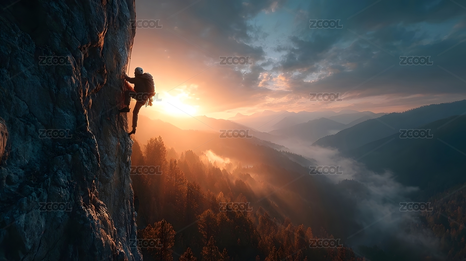攀岩者夕阳绝壁