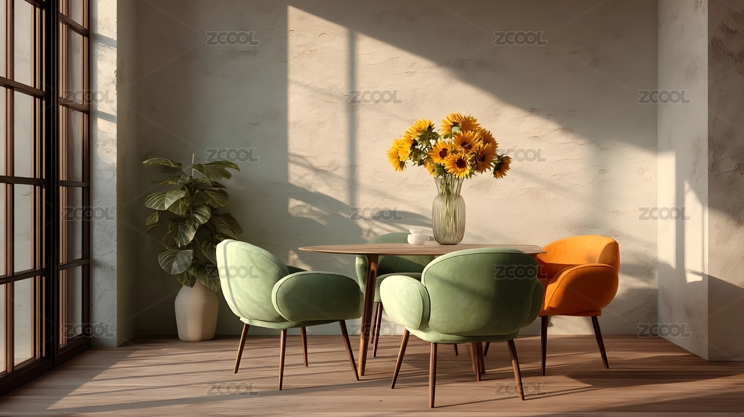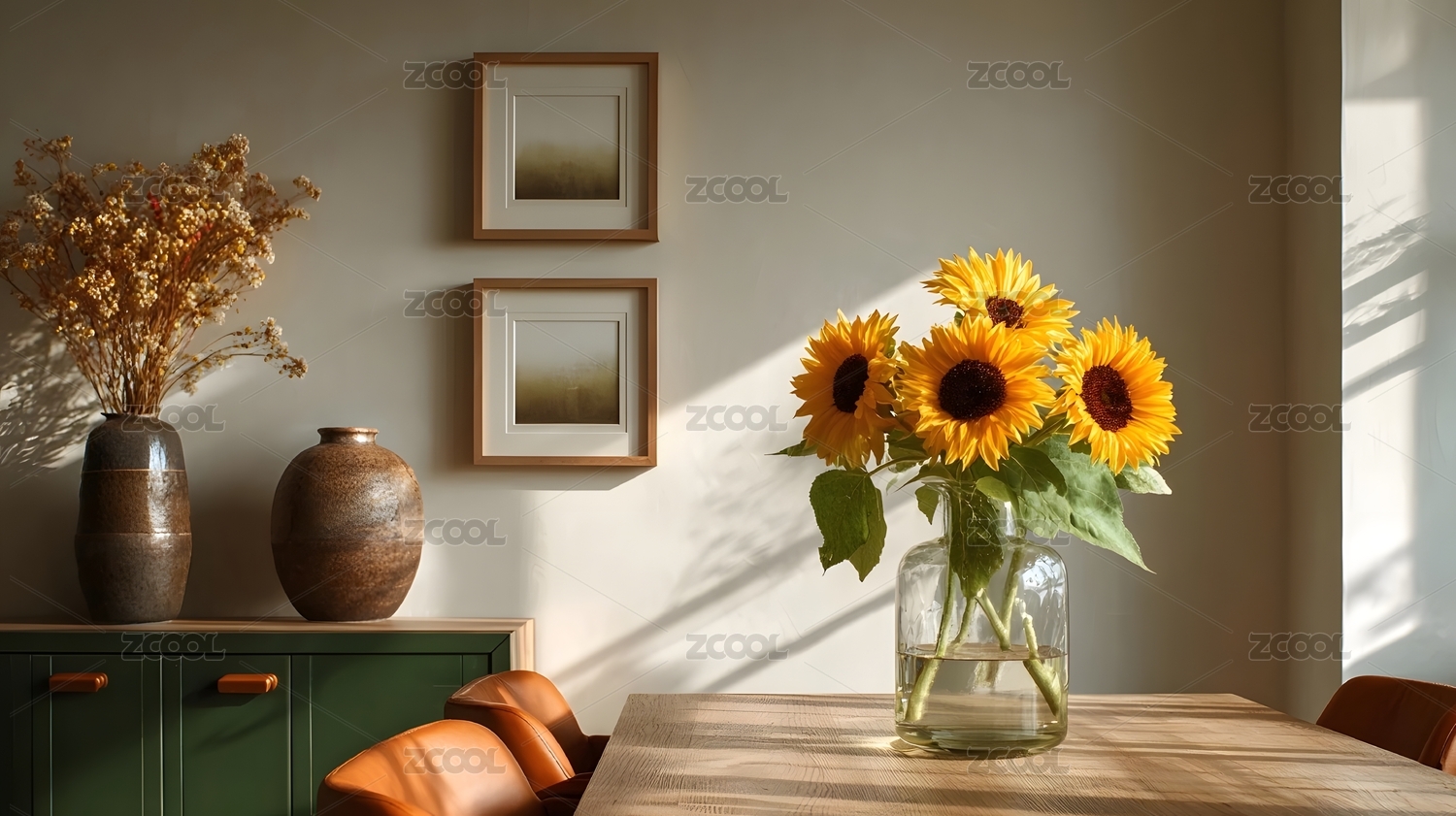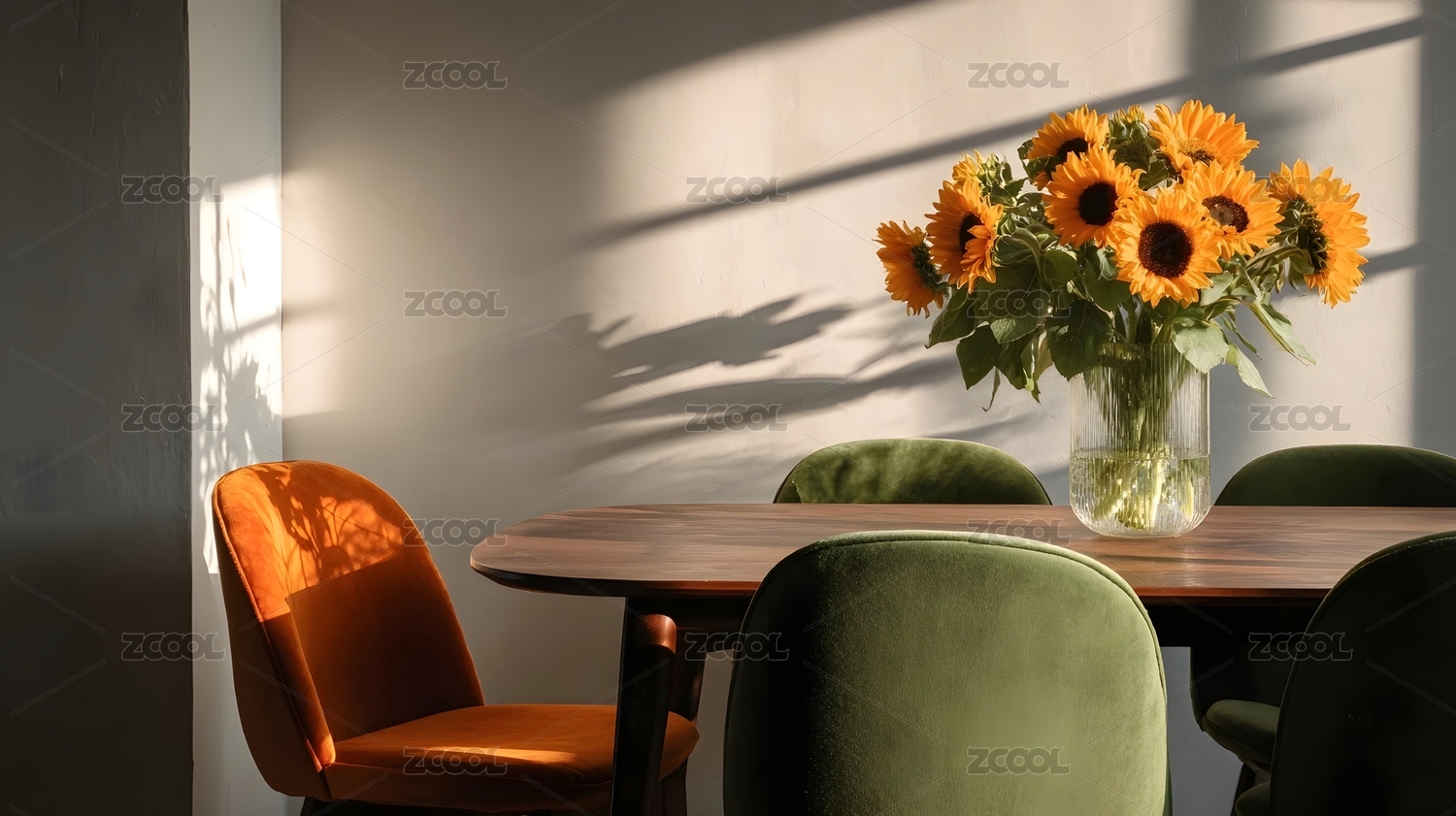 室内,阳光,向日葵,花瓶,桌子,椅子,绿色,橱柜,木桌,花朵