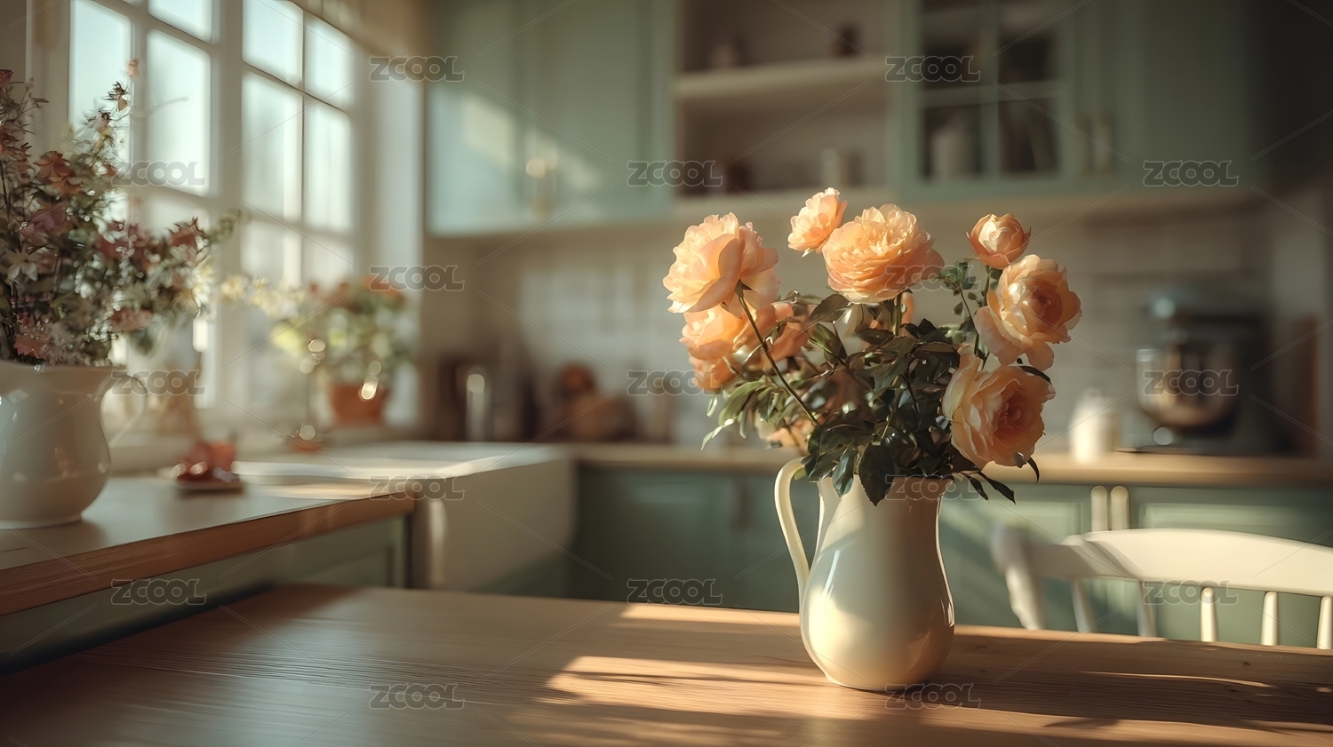 一束鲜艳的玫瑰花摆放在厨房桌上的花瓶中