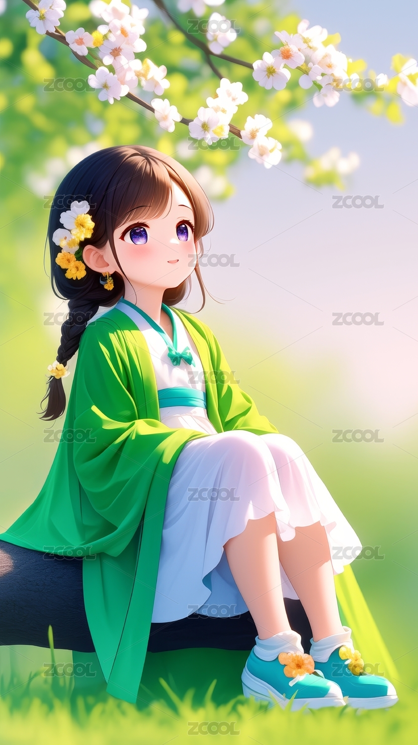 绿衣少女赏花
