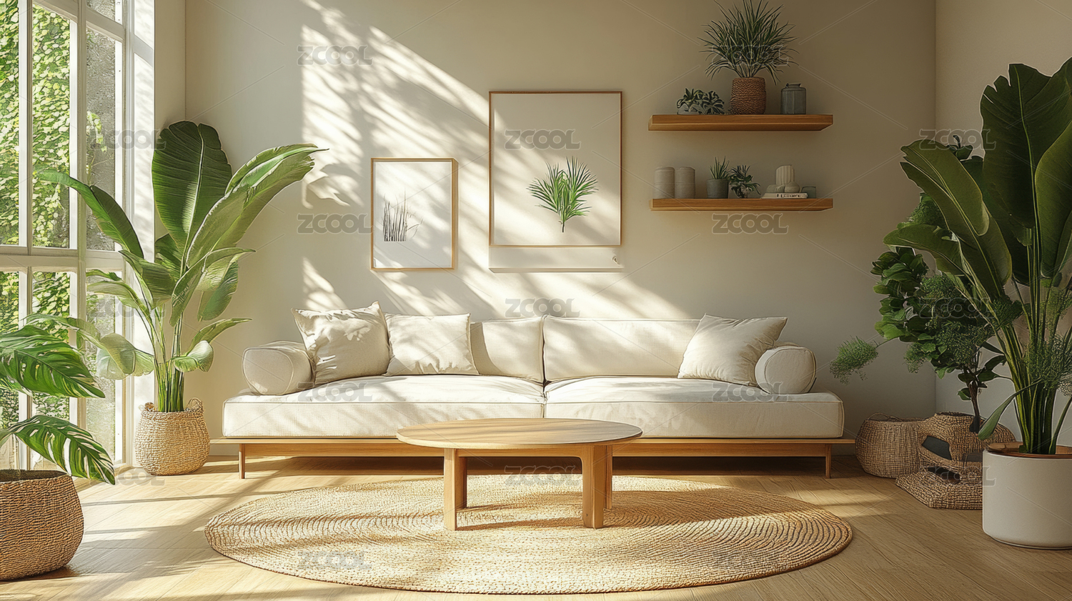 室内的白色沙发、木制茶几、绿色植物等