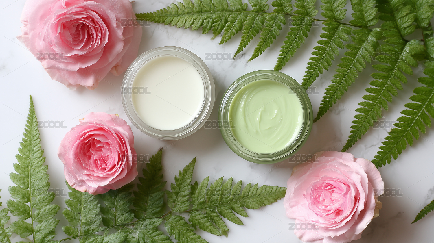 美容,护肤,布置,罐子,打开,乳霜,白色,凝胶,绿色,玫瑰