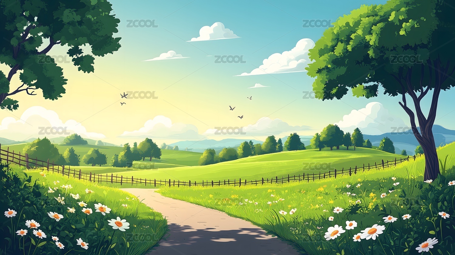 田园小路与雏菊花田