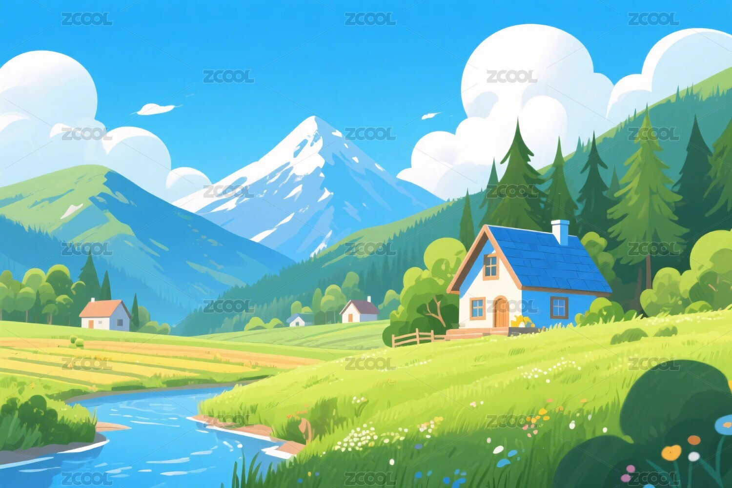 卡通乡村田园农舍小屋卡通插画