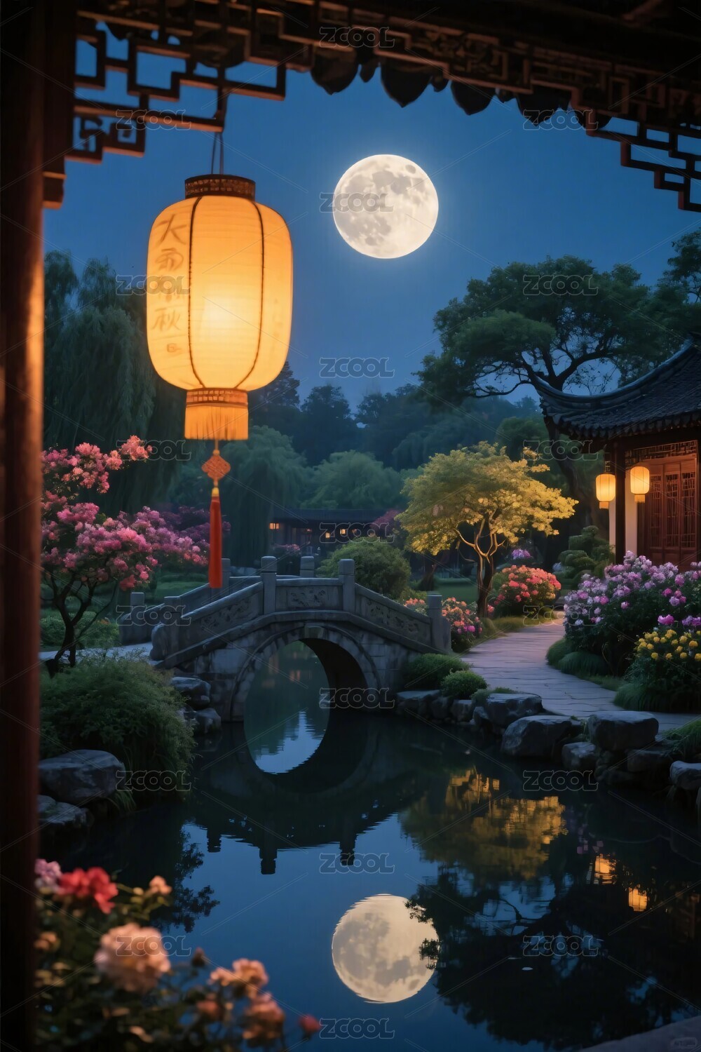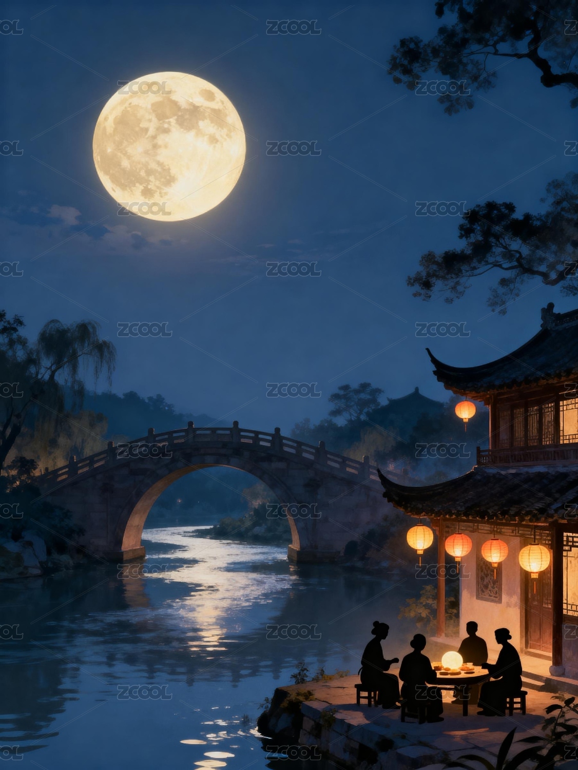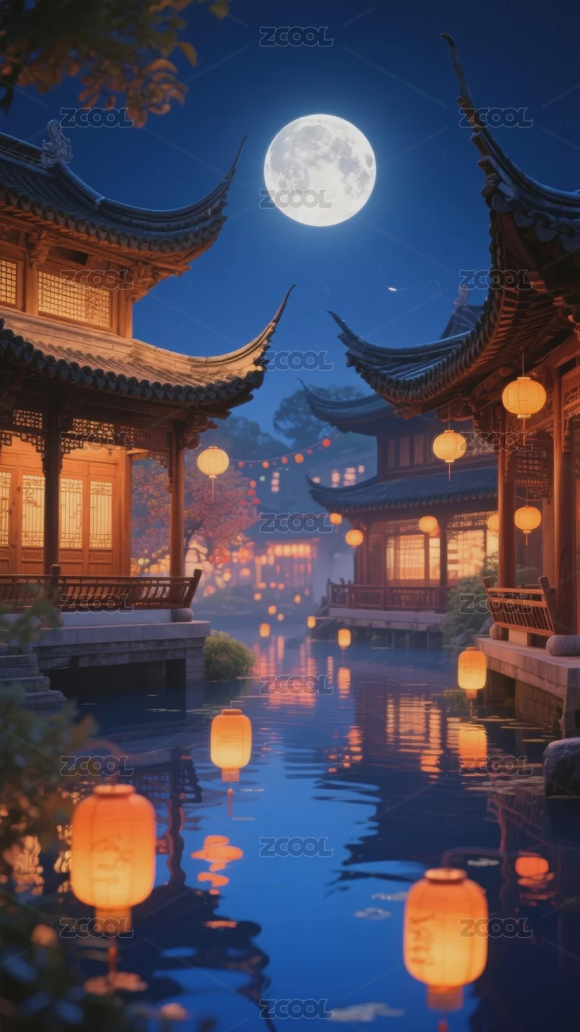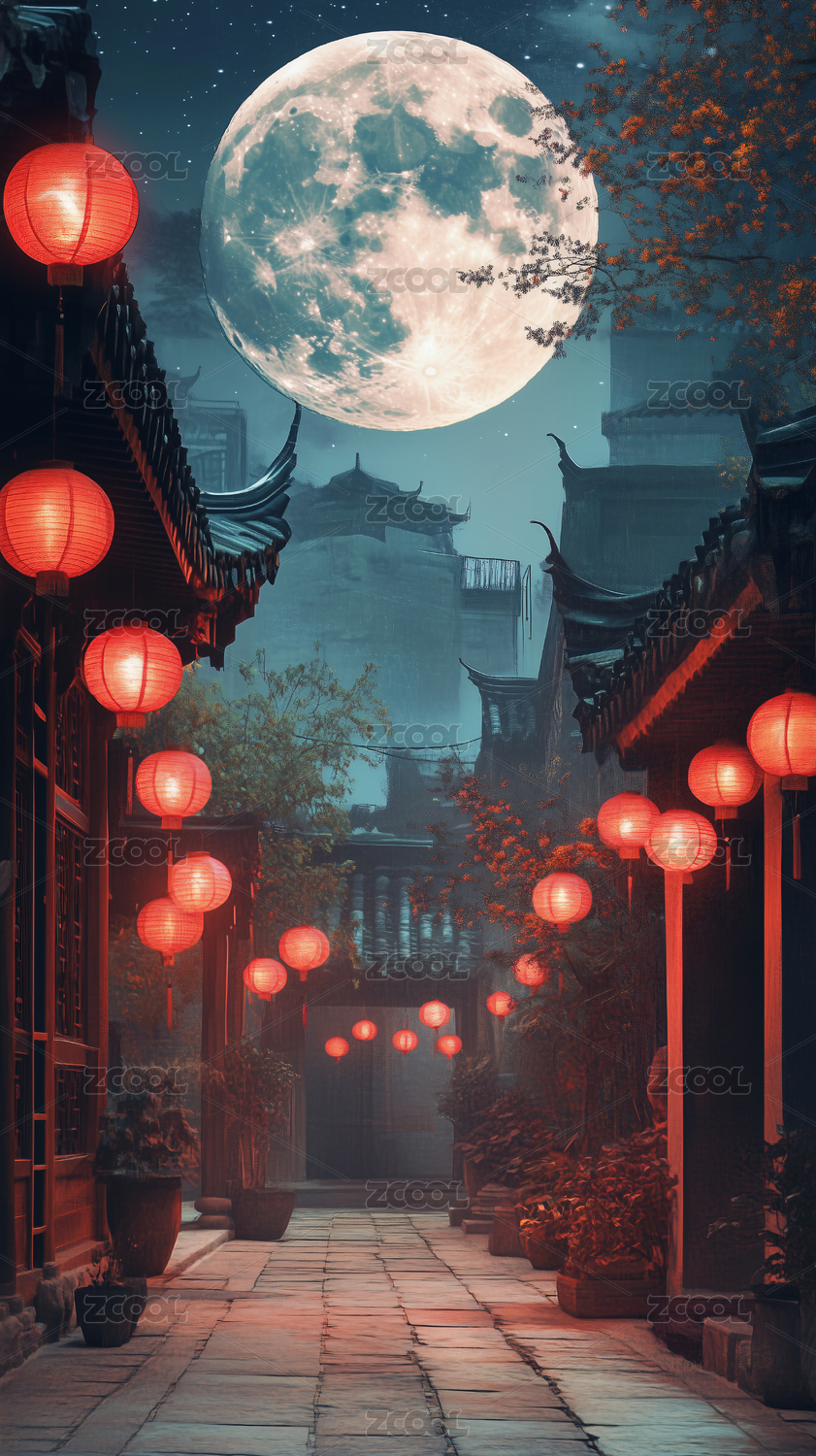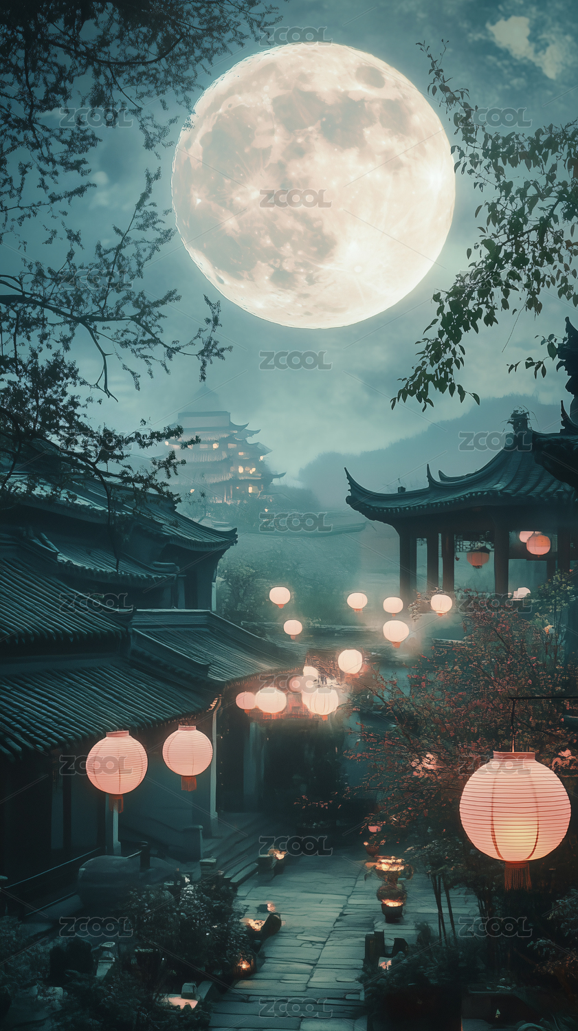 夜晚水乡灯笼与满月映照的古镇