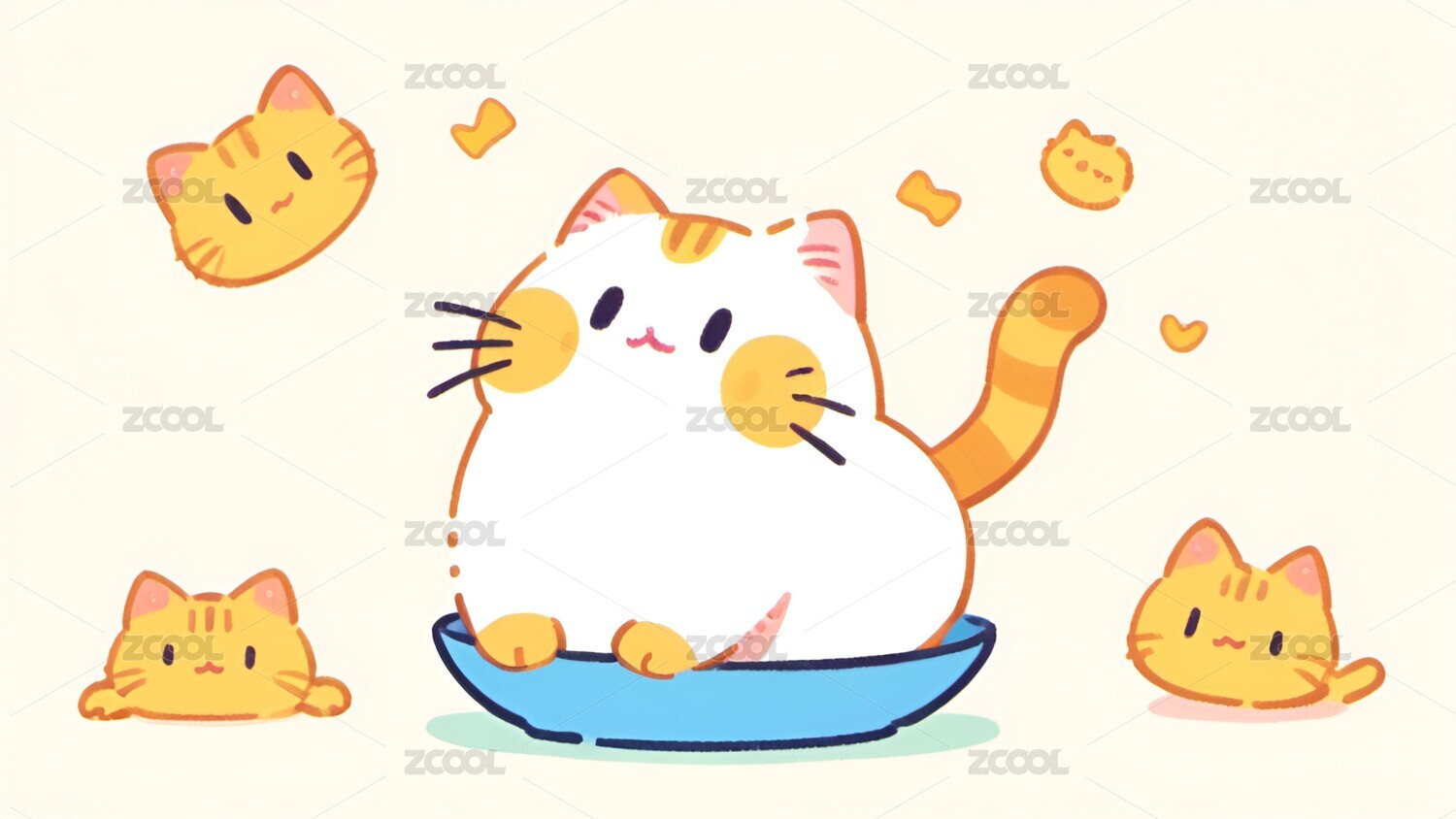 卡通可爱猫吃水果沙拉食物开心温暖治愈插画