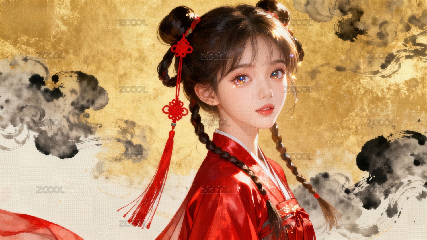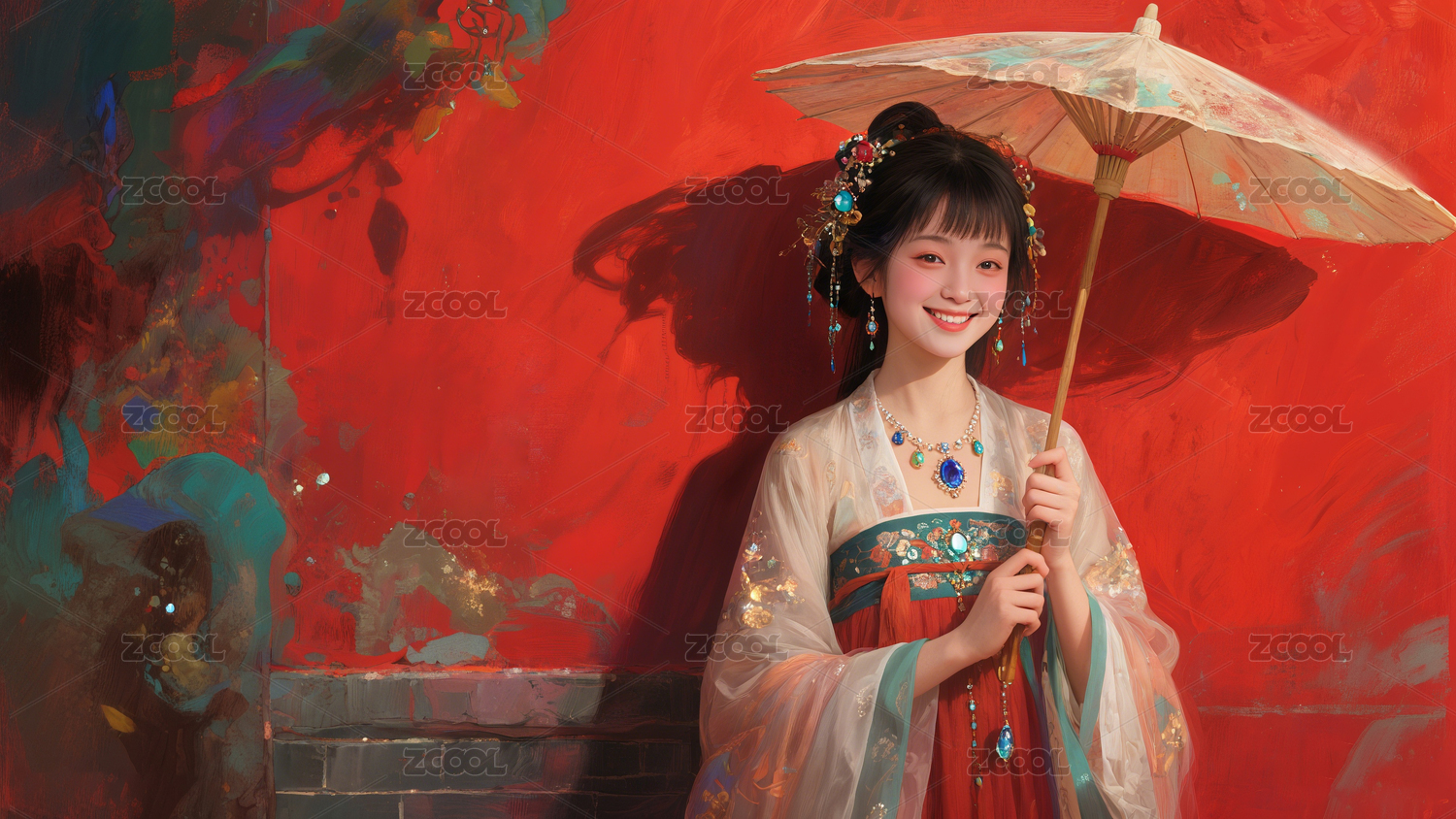 国风,红墙,纸伞,珠宝,少女,油画,艺术,背景
