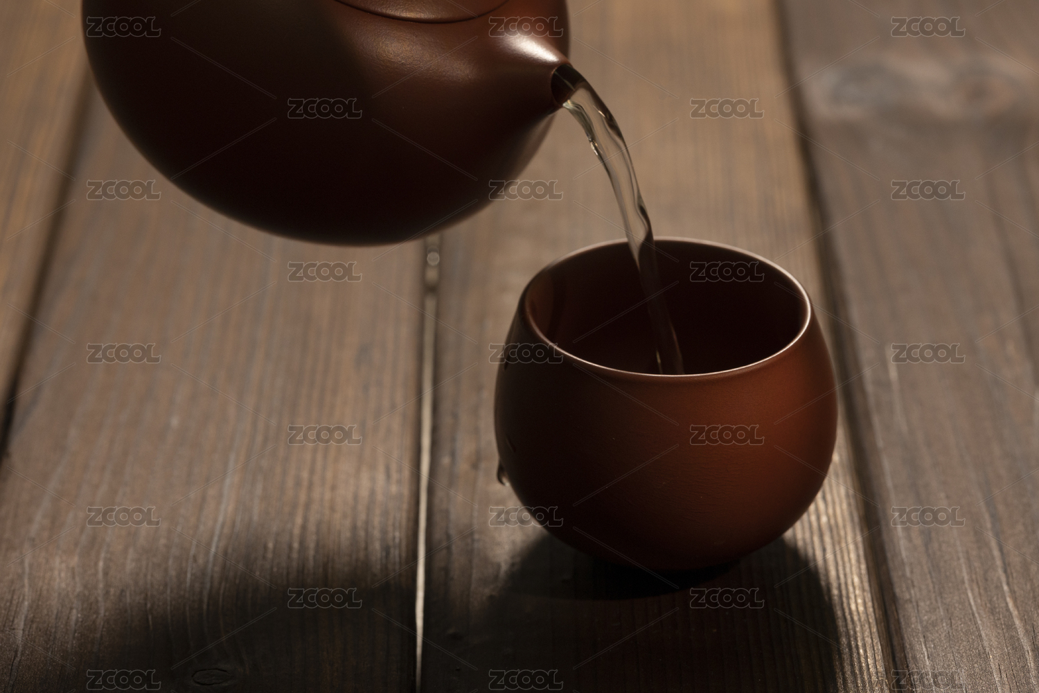 手拿朱泥紫砂壶往朱泥紫砂杯里倒茶水