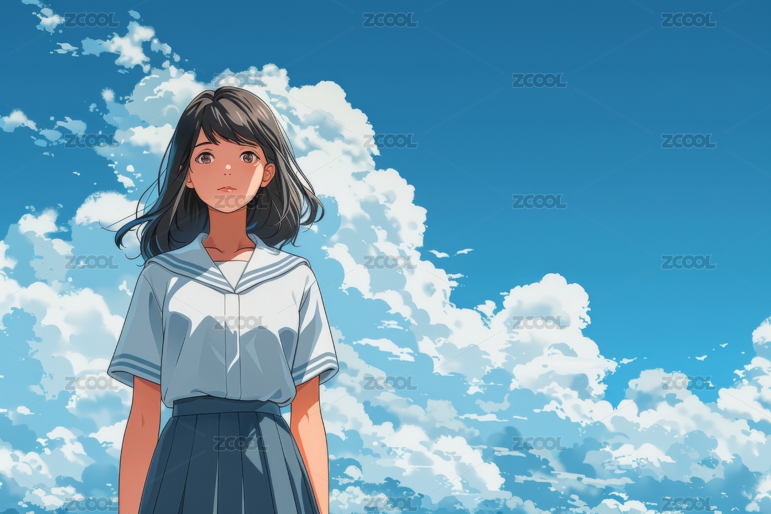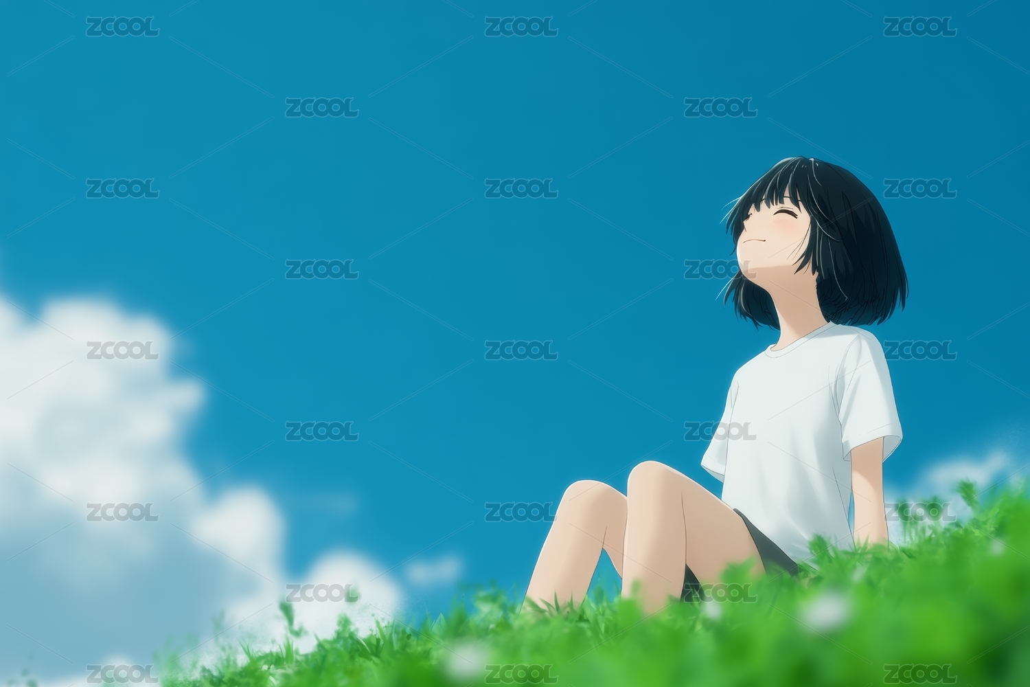 少女,卡通,插画,微笑,蓝天,白云,草地,短发,白色,连衣裙